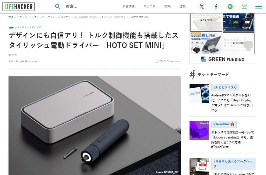 2023年6月23日、Lifehackerで「ネジを傷めないスマートチップ搭載の電動ドライバー【HOTO SET MINI】」を紹介して頂きました!