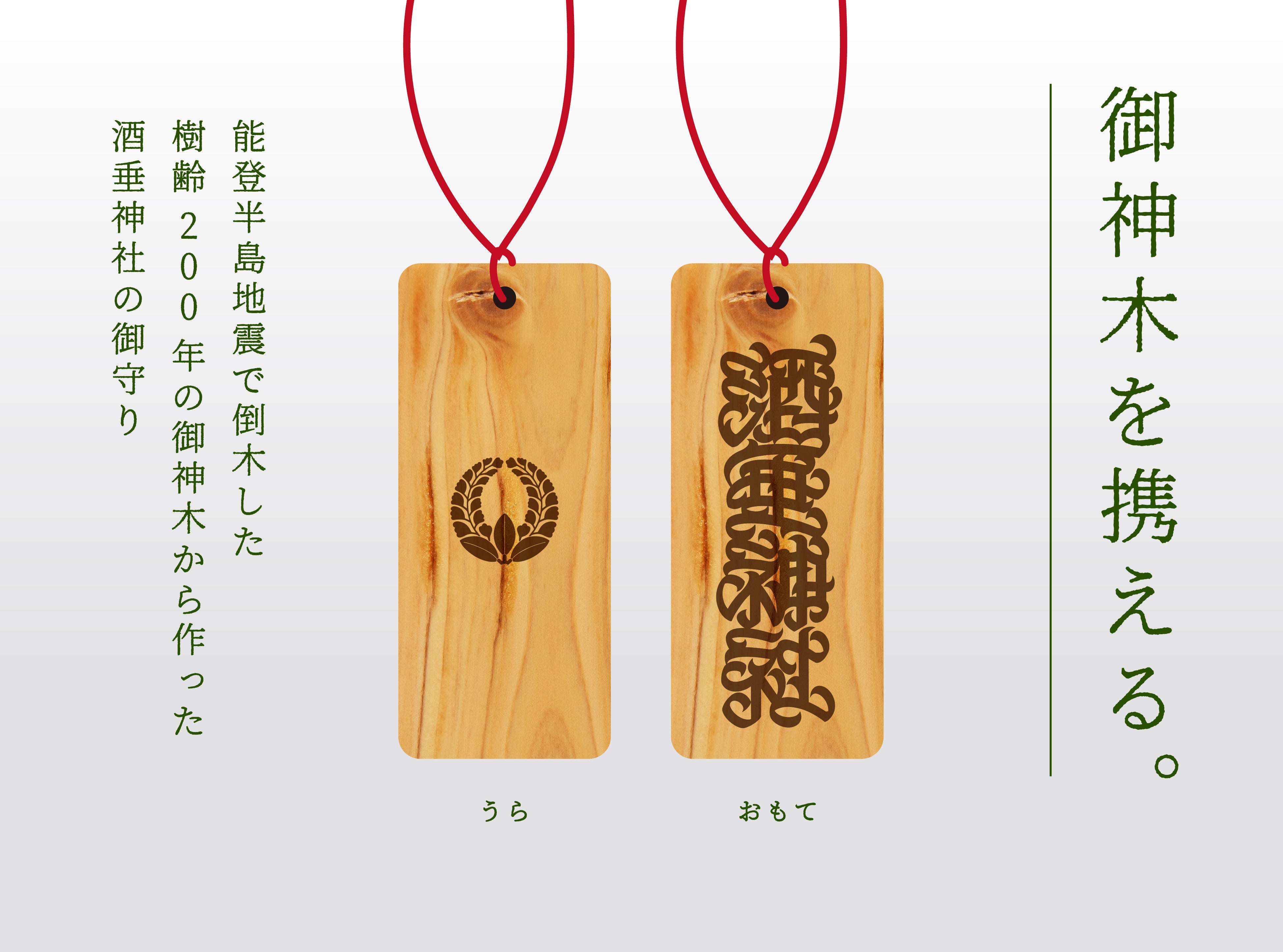 長いあいだ能登の里山里海と人々を見守ってきた御神木は、本殿の修復のための材となり、その一部は身につけられる御守りにします。神前からのおかげをいただき、みなさまが健やかに過ごせるように願っています。