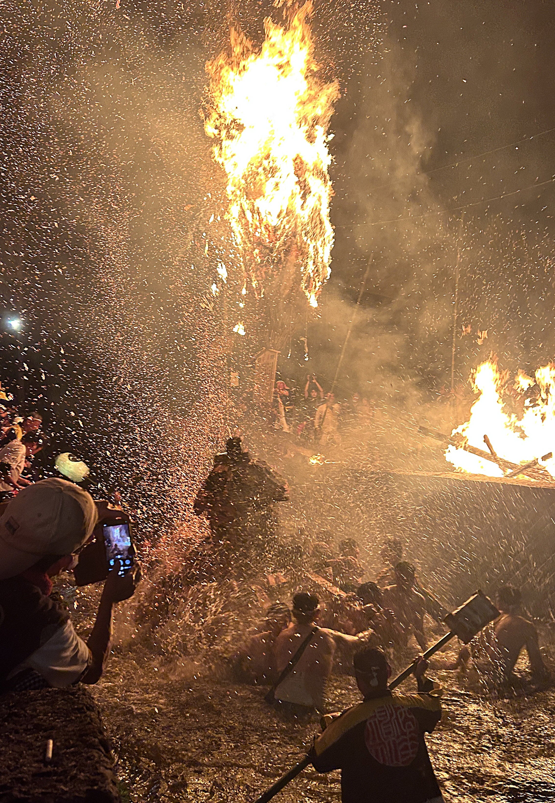 5日の夜、大松明の周りを火の粉を浴びながらねり回るキリコ(大きな奉燈)