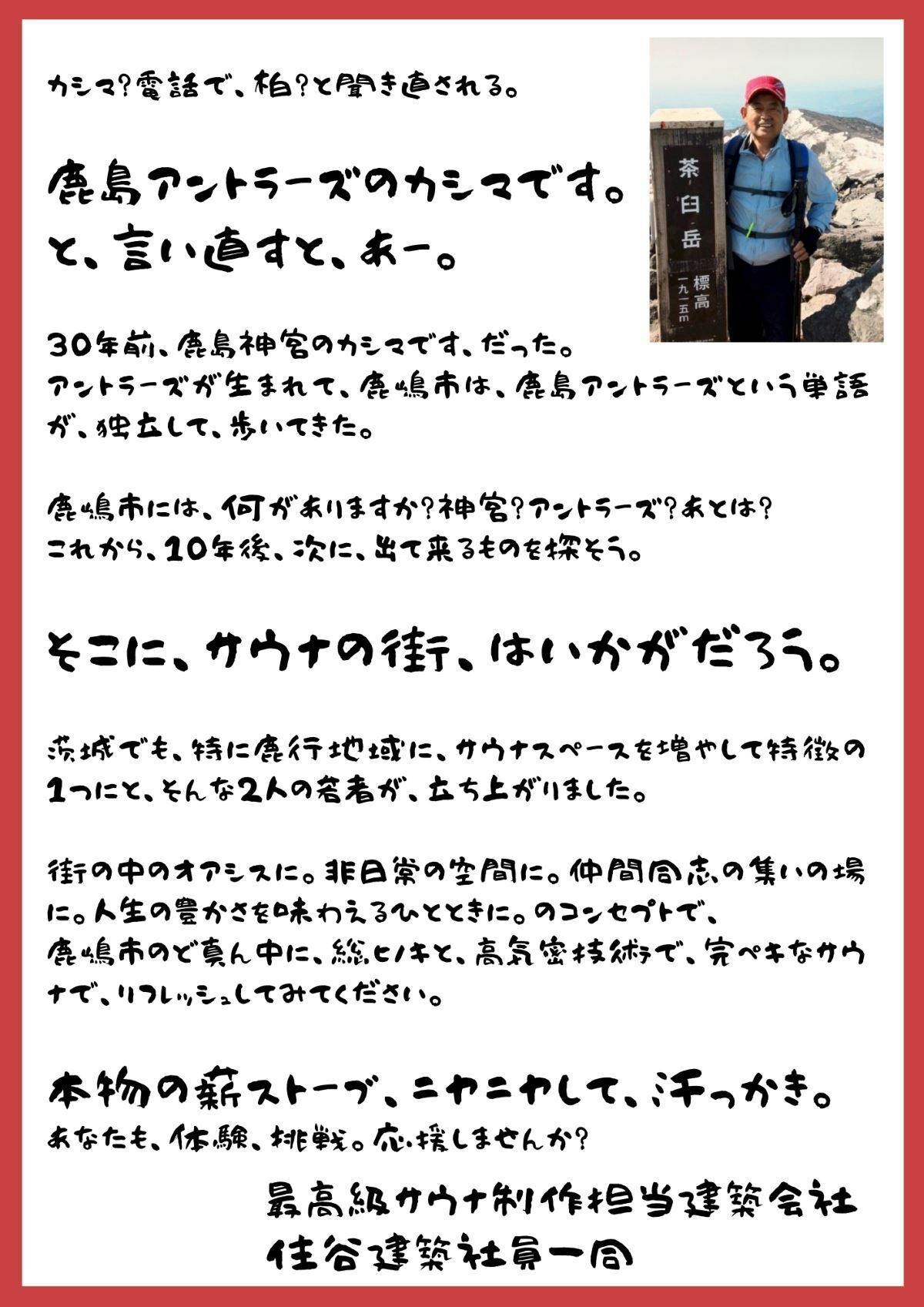 鹿島アントラーズ・鹿島神宮と並ぶ、鹿嶋市の"絶対行くべき"観光スポットになれるようなサウナを創ります!