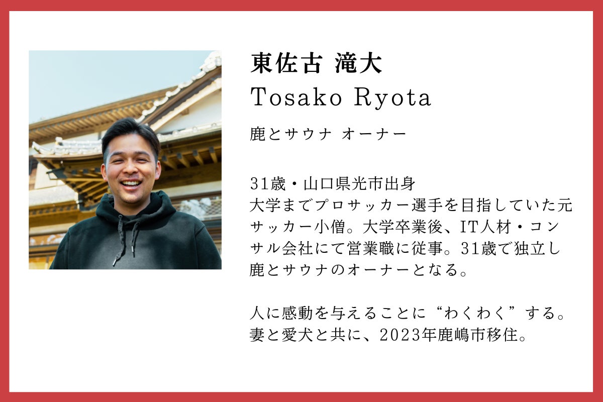 東佐古 滝大(とうさこ りょうた)と申します。「鹿とサウナ」のオーナーとして、サウナの立上げを行っております。2023年の夏に、東京から茨城県鹿嶋市に移住してきました。移住後1年弱経ちますが、鹿嶋市の多くの方々に支えられ、「鹿とサウナ」のオープンにむけて、頑張っています。