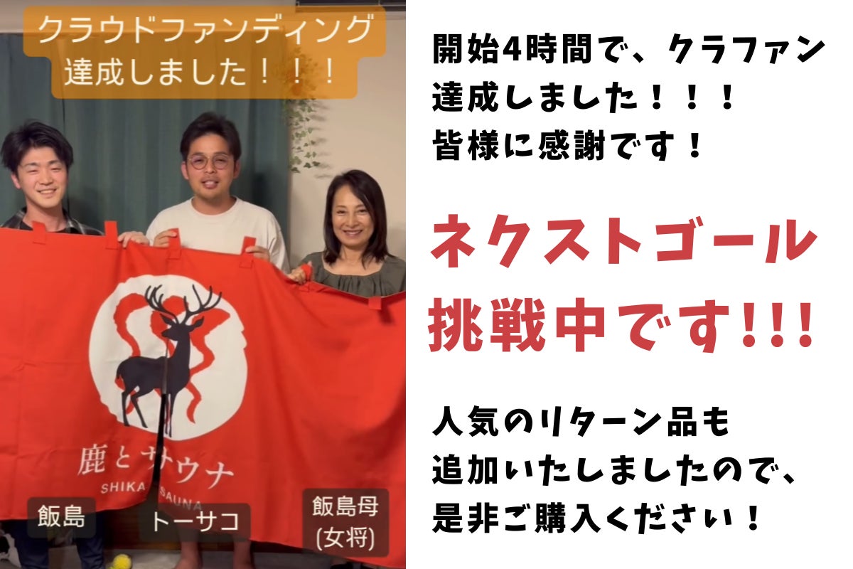 2024/08/04 16:21こんにちは!鹿とサウナの東佐古です!鹿とサウナがオープンして約1ヶ月が経ちました。皆様のご支援のおかげで、オープン1ヶ月でたくさんのお客様にお越し頂き満足して頂けるお時間の提供ができました!クラファンの支援状況をみてお越しいただいた方もいらっしゃったり、皆様の応援に本当に感謝しております!リターンについても皆様にお送りできましたのでぜひお時間がある時にご確認いただけると幸いでございます。引き続きサウナのアップデートをして皆様に楽しんで整って頂けるお店を作っていきますのでどうぞ宜しくお願い致します。お店周辺や鹿嶋方面に来られる機会がある方はぜひサウナにお越しいただけると幸いでございます!いつでもお待ちしております^^!【割引チケットをご購入頂いている皆様へ】割引チケットの有効期限は2024年12月31日までとなります。こちら年内の枠数も限られているため、可能な方はぜひ順次ご予約を頂けると幸いでございます。皆様のご来店、心よりお待ち申し上げております。 もっと見る「鹿とサウナ」クラウドファンディングプロジェクトの終了のご報告