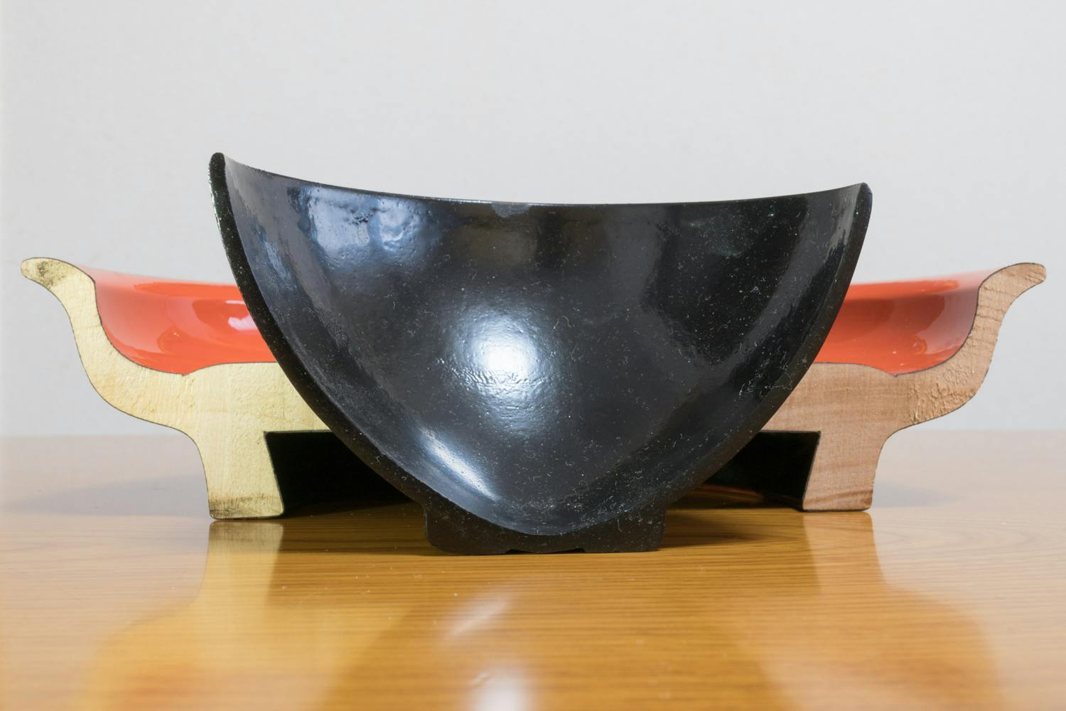 【半分に切った『芯漆』作品(前)と、従来の漆器(後)を比較。従来の漆器の漆塗の層は0.01ミリほどで、ほとんどが木地。『芯漆』は全て漆、木地未使用】