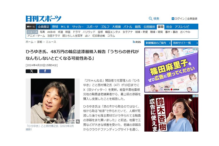 ひろゆきさんが再び、 木地を一切使わず、国産漆のみでつくる「芯漆(しんしつ)」作品を購入してくださいました。感謝です!ありがとうございます!◆ ひろゆき氏、48万円の輪島塗漆器購入報告「うちらの世代がなんもしないと亡くなる可能性ある」https://twitter.com/hirox246/status/1781561255251104125