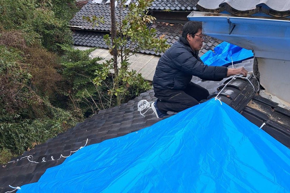 今日は西日本 大雨警報のため、剥がれたブルーシートを張り替えました。年齢が年齢なので屋根に上るのはちょっと怖いですね。