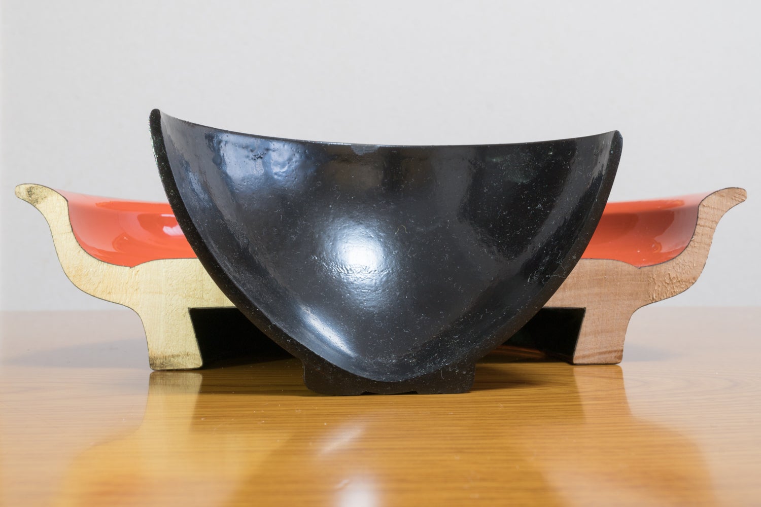 【半分に切った『芯漆』作品(前)と、従来の漆器(後)を比較。従来の漆器の漆塗の層は0.01ミリほどで、ほとんどが木地。『芯漆』は全て漆、木地未使用】