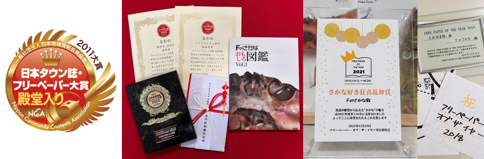「Fのさかな」は、日本フリーペーパー大賞、フリーペーパーオブザイヤー、日本地域コンテンツ大賞といったアワードで高い評価をいただき、昨年の2023年11月28日には日本地域コンテンツ大賞の「ビジネスモデル部門」と「隈研吾 特別賞部門 」でW受賞させていただきました。この受賞については、読者の皆様のご意見を元に創刊した「Fのさかな図鑑」が対象となりました。このように「Fのさかな」は全国の読者の皆様と能登半島の皆様と共に成り立ってきました。「Fのさかな」を見て能登に来た、巡った、お店に行ったなど、読者の方々の温かいお便りや応援してくださる声が次の発行への励みとなっており、また多方面でご協力いただいている広告主、水産関係者、取材に応じてくださる地元の皆様のご協力で成り立っております。