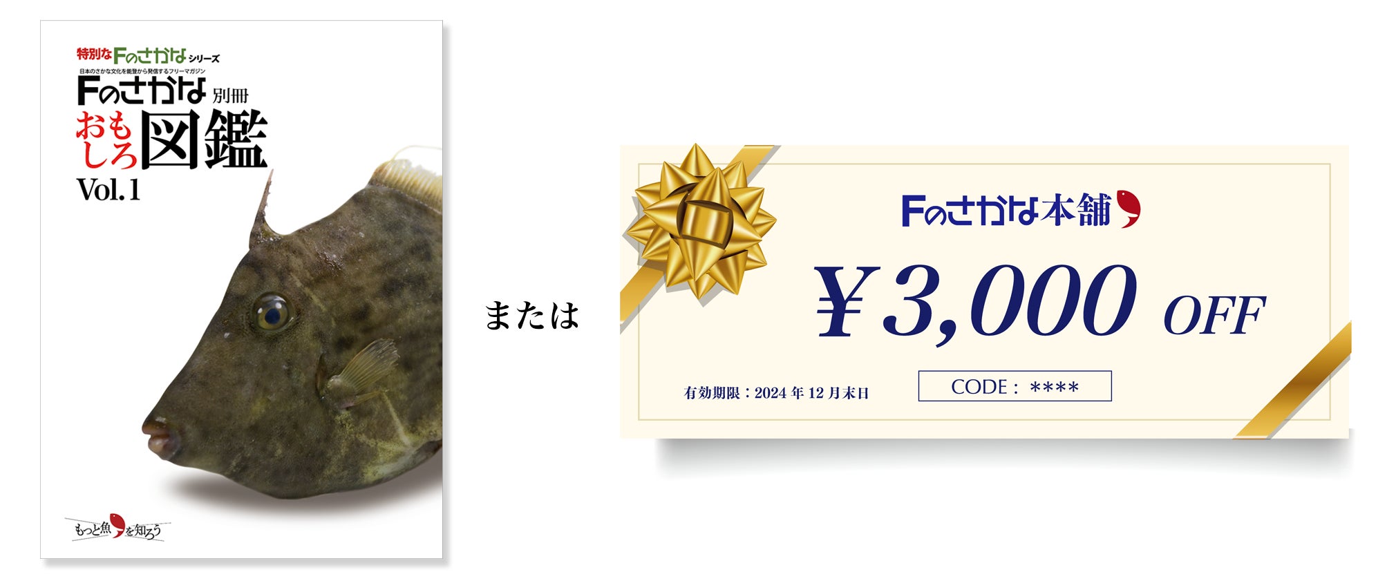 ・ご希望のFのさかな図鑑1冊または通販サイトFのさかな本舗で使えるクーポン券(3,000円分)
