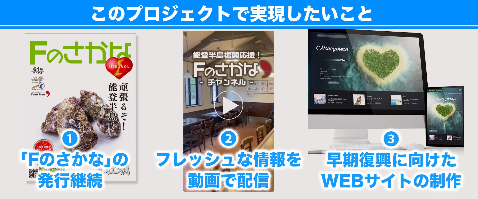 早期復興に向けて、「Fのさかな」は再び能登の美味しい魚や自然・文化などを皆さんにお届けし、能登に残る人たちの頑張り、能登以外で頑張る人たちの思いを途切れさせなよう、多くの方にご紹介できればと思い、下記3項目の実現を目指したいと思います。