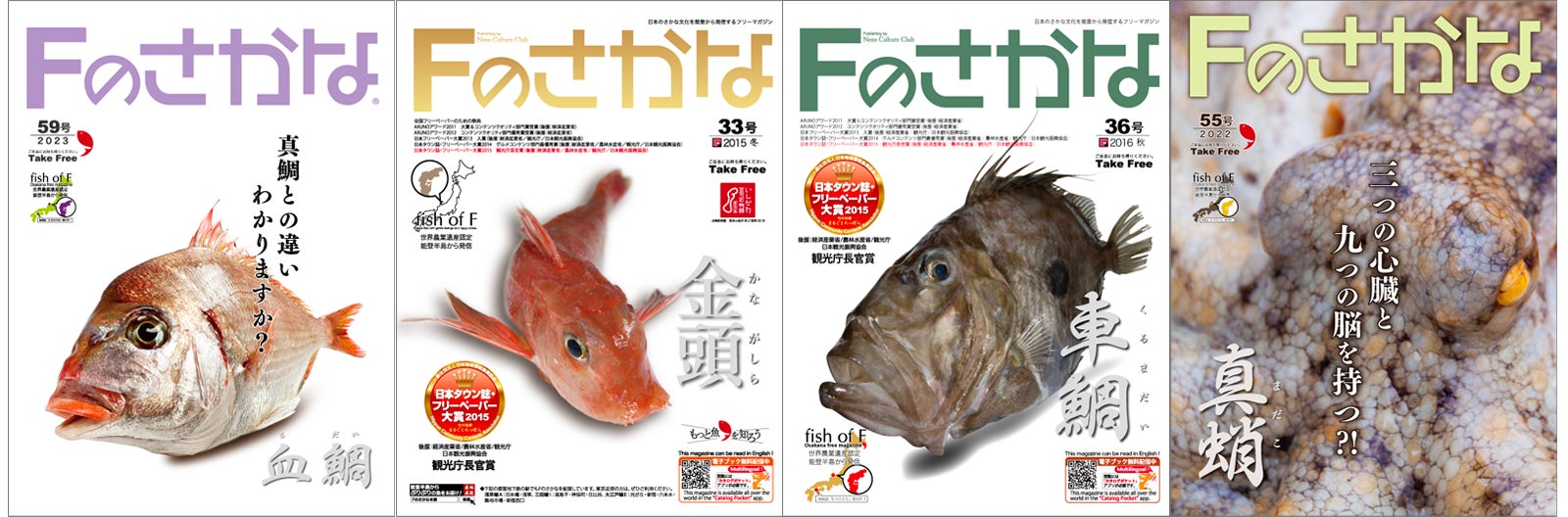 「Fのさかな」は、日本フリーペーパー大賞、フリーペーパーオブザイヤー、日本地域コンテンツ大賞といったアワードで高い評価をいただき、昨年の2023年11月28日には日本地域コンテンツ大賞の「ビジネスモデル部門」と「隈研吾 特別賞部門 」でW受賞させていただきました。この受賞については、読者の皆様のご意見を元に創刊した「Fのさかな図鑑」が対象となりました。このように「Fのさかな」は全国の読者の皆様と能登半島の皆様と共に成り立ってきました。「Fのさかな」を見て能登に来た、巡った、お店に行ったなど、読者の方々の温かいお便りや応援してくださる声が次の発行への励みとなっており、また多方面でご協力いただいている広告主、水産関係者、取材に応じてくださる地元の皆様のご協力で成り立っております。