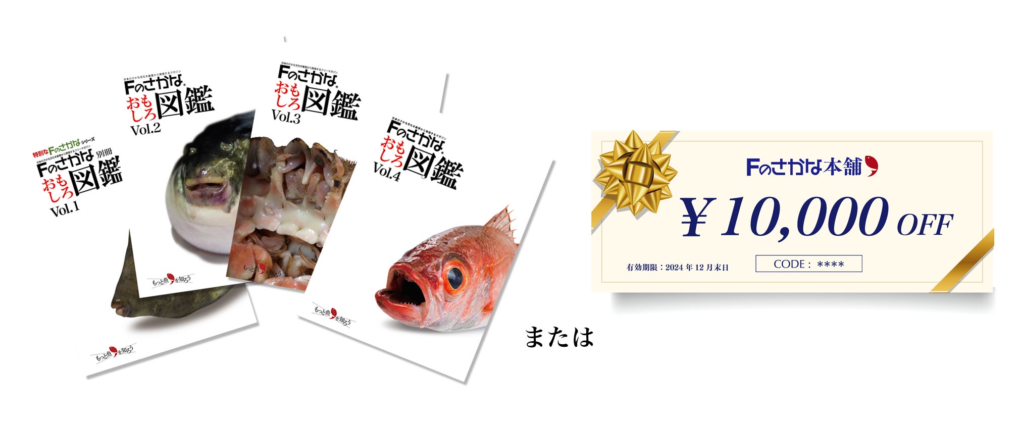 ・Fのさかな図鑑1〜4号のセットまたは通販サイトFのさかな本舗で使えるクーポン券(10,000円分)