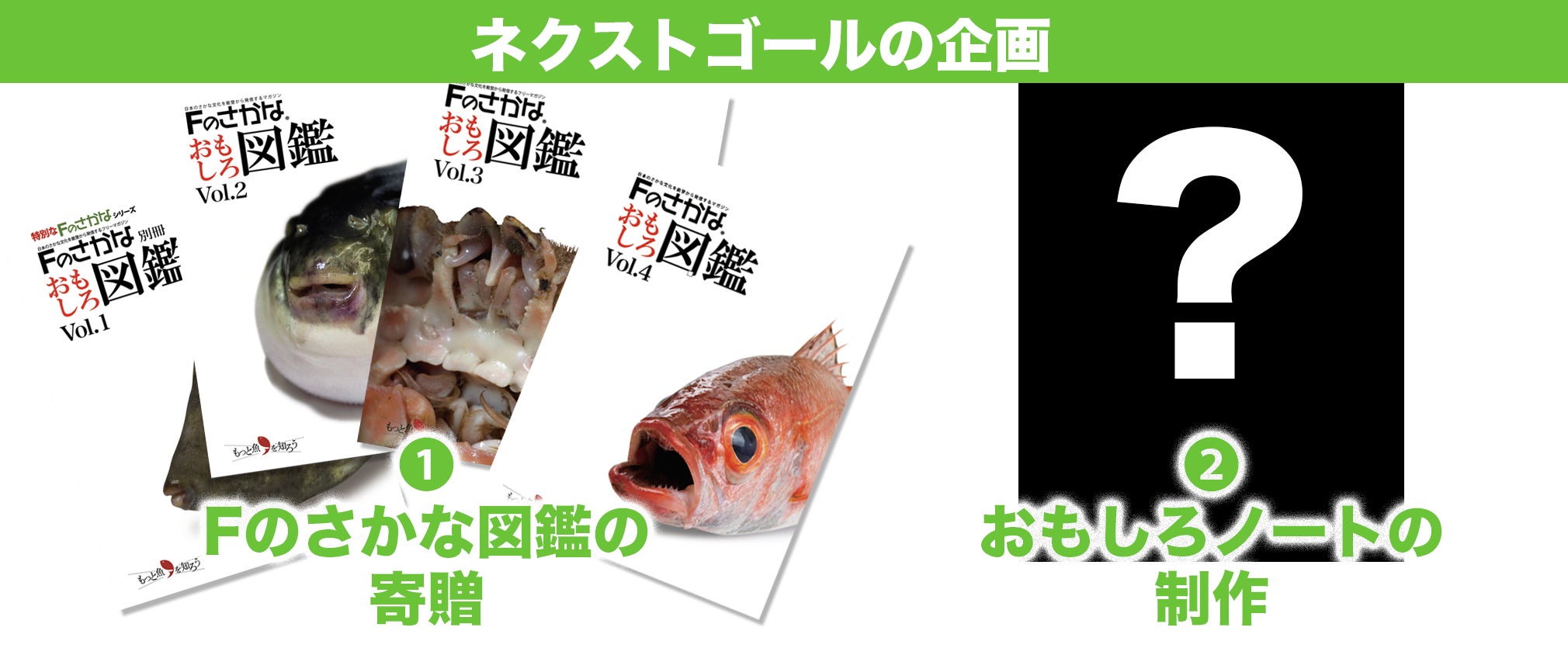 ・ご希望のFのさかな図鑑2冊または通販サイトFのさかな本舗で使えるクーポン券(5,000円分) ※Vol.1〜Vol.4のうち、ご希望の2冊を備考欄にご記入ください。