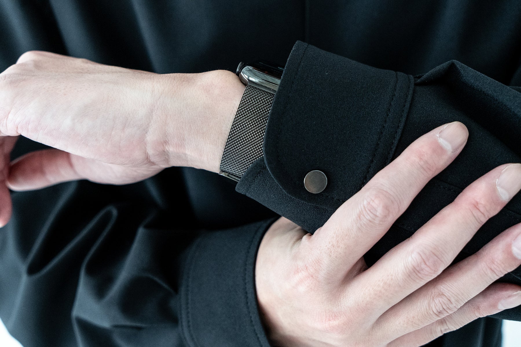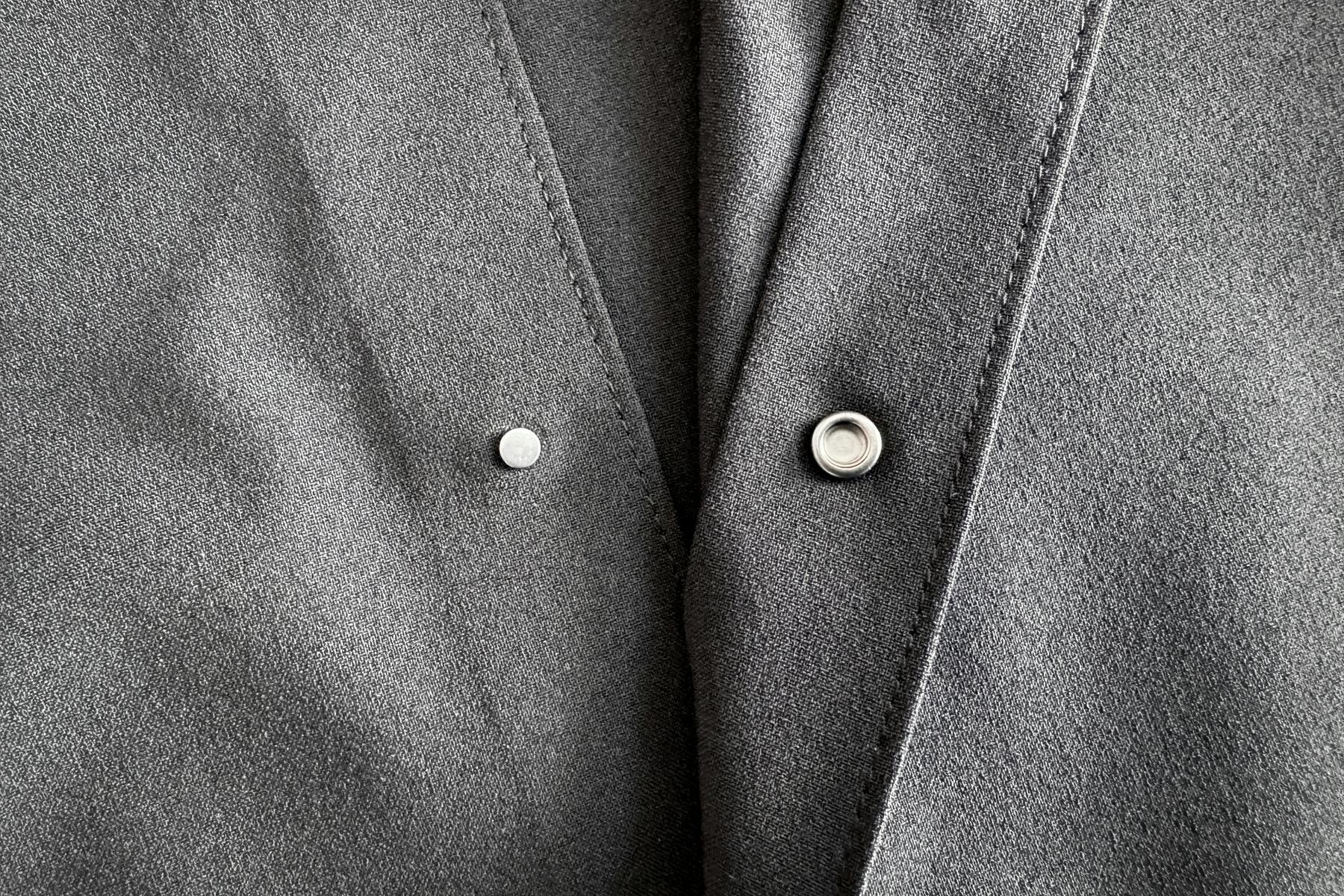 カフスのボタンもブラインドホックで統一感を出しています。パチンと外せるので、腕をまくるときも便利です。