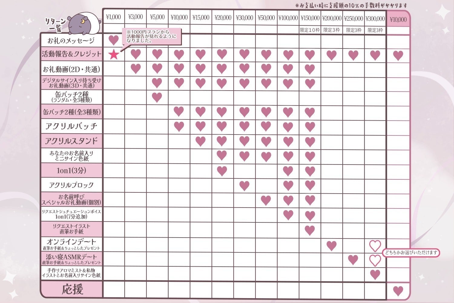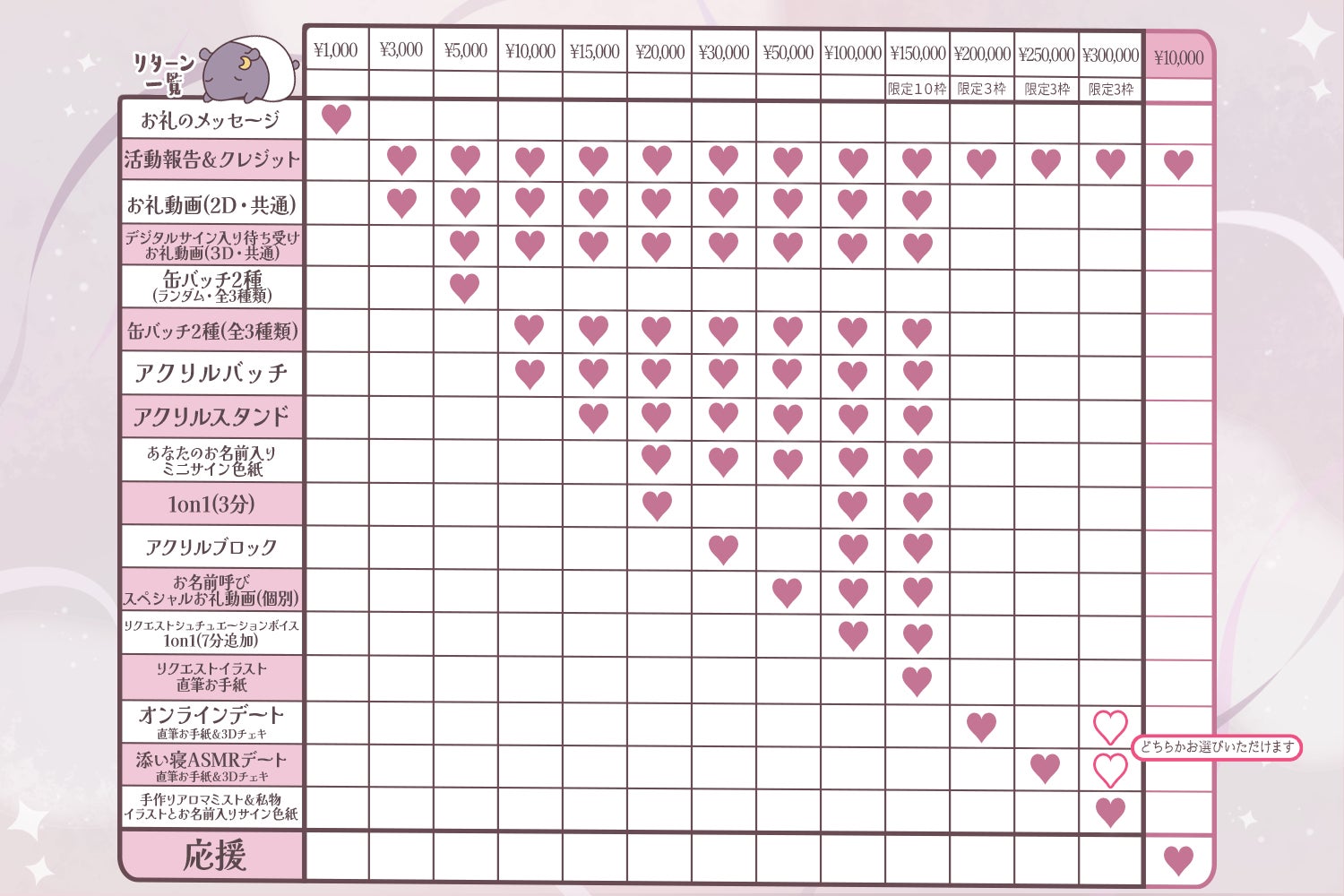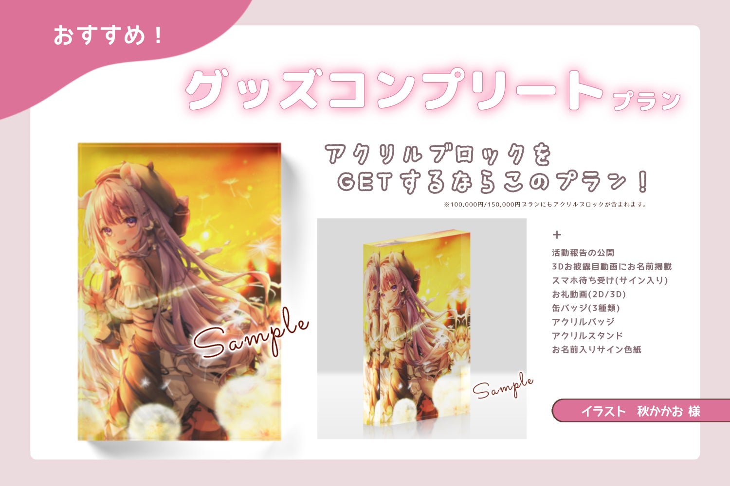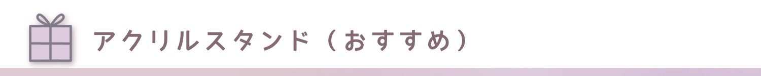 ・活動報告・クレジット・お礼動画(2D・共有/3D・共有)・デジタルサイン入りスマホ待ち受け・缶バッジ3種類(全種類)・アクリルバッジ・アクリルスタンド・お名前入りミニサイン色紙・アクリルブロック・お名前呼びスペシャル動画(3D・個別)・リクエストシチュエーションボイス・1on1(10分)