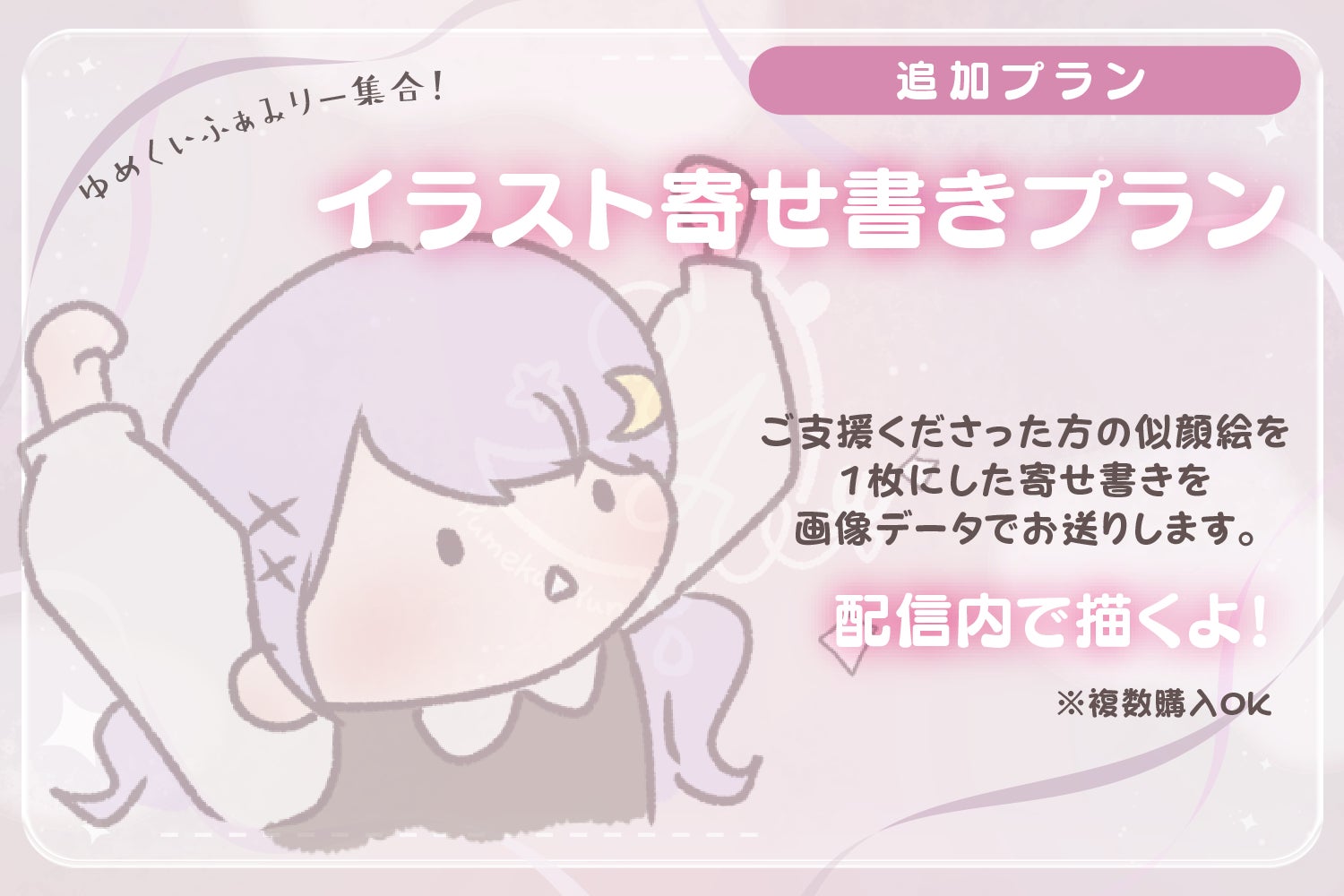 ゆん特有のゆるっとしたイラストを、配信内でリアルタイムで描くので思い出深い1枚になるはず!!
