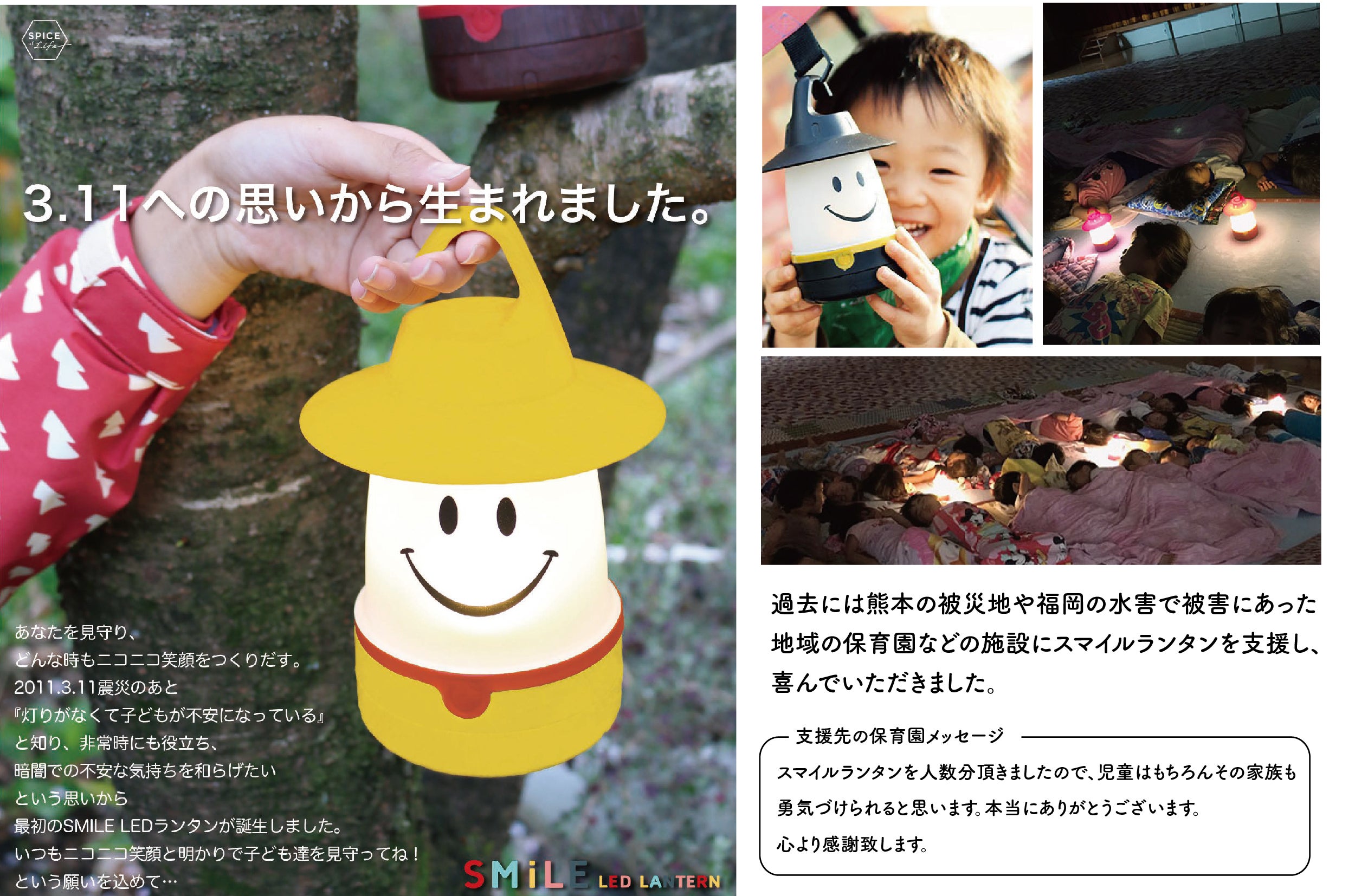 2011.3.11東日本大震災時「灯りがなくて子どもたちが不安がっている」という声を聞き、暗闇での不安な気持ちを和らげたいという思いから、いつもニコニコ明るい笑顔で子どもたちを見守ってね!という願いを込めて誕生した「スマイルLEDランタン」。日常から子どもたちを笑顔で見守ってくれました。