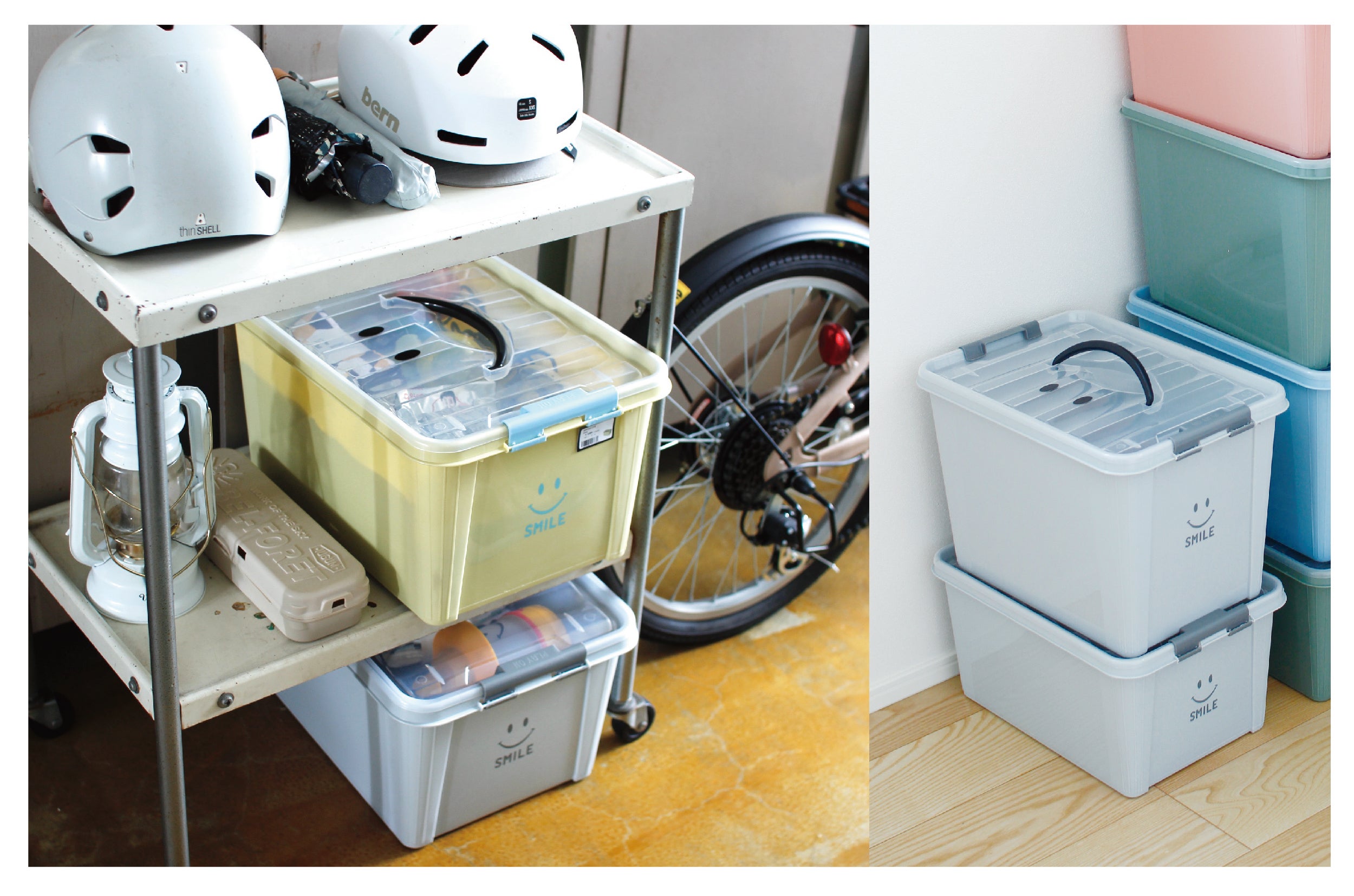 笑顔がかわいい透明フタのボックス。スマイルの口部分が持ち手になっていて、片手で持ち運びができます!