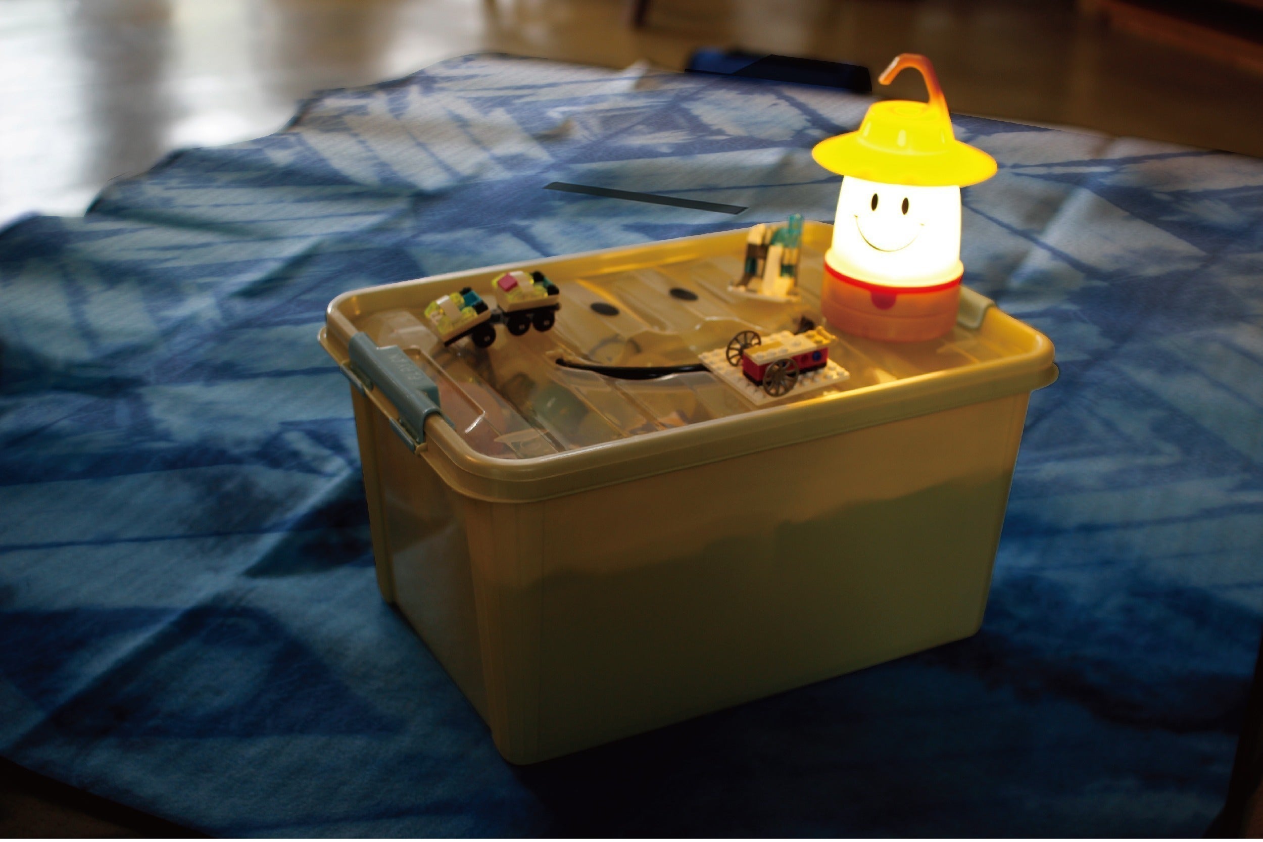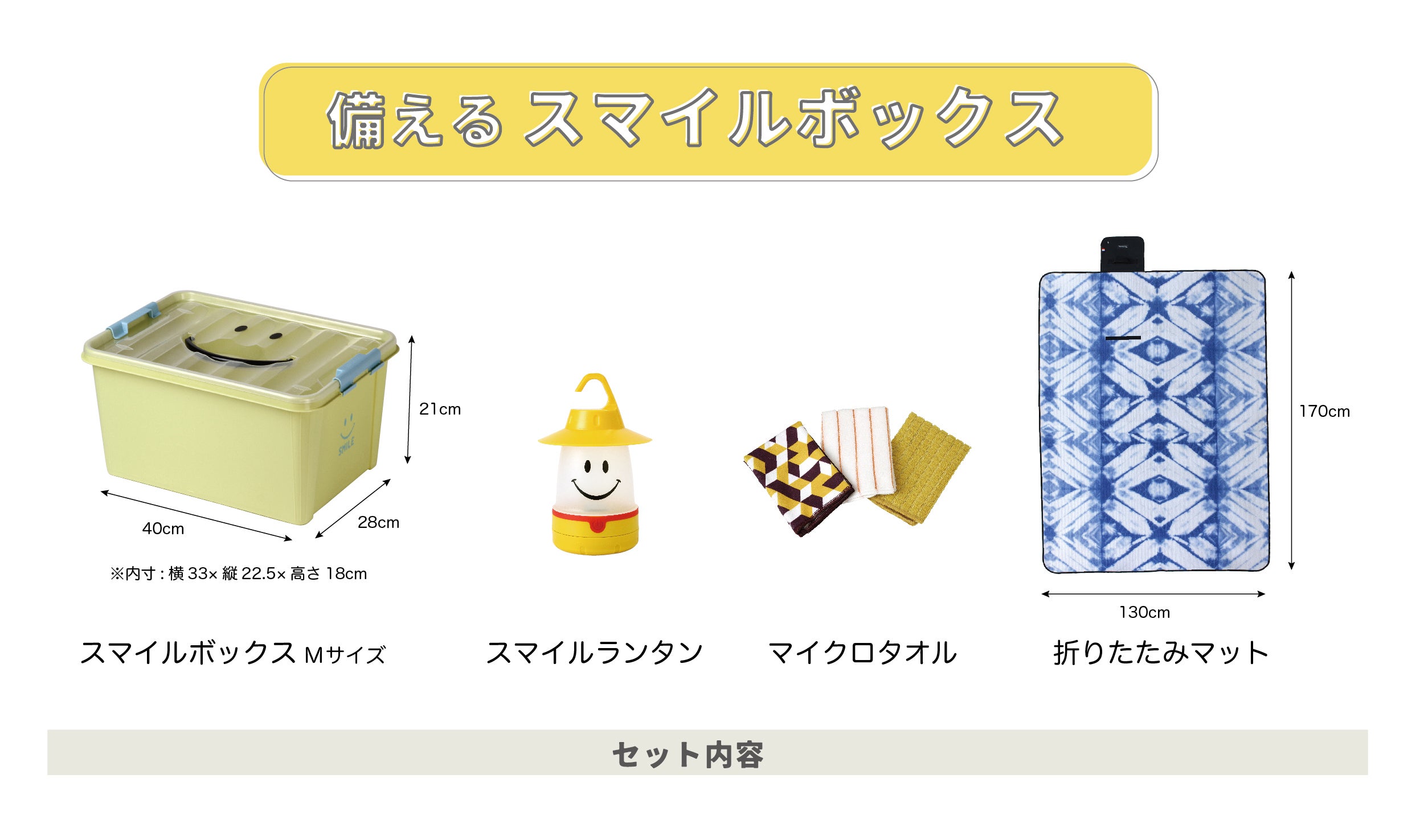 そこで、災害時に咄嗟に持ち出す一時避難の防災用具とは別に、十分な安全の確認ができた後の二次避難や在宅避難時に必要なものを分けて、子連れ防災に役立つものをここに入れて準備して欲しいという思いから、スマイルボックス、スマイルランタン、マット、タオルのセットを作りました。