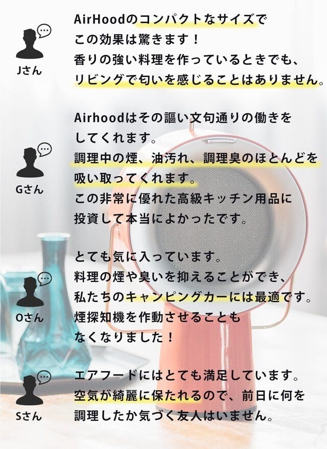 新しいエアフードを気に入っている。古いアパートで、煙や油を逃がすシュートがどこにもないんだ。Airhoodのおかげで助かっている。拭き掃除をする必要がなくなった。素晴らしい装置をありがとう。