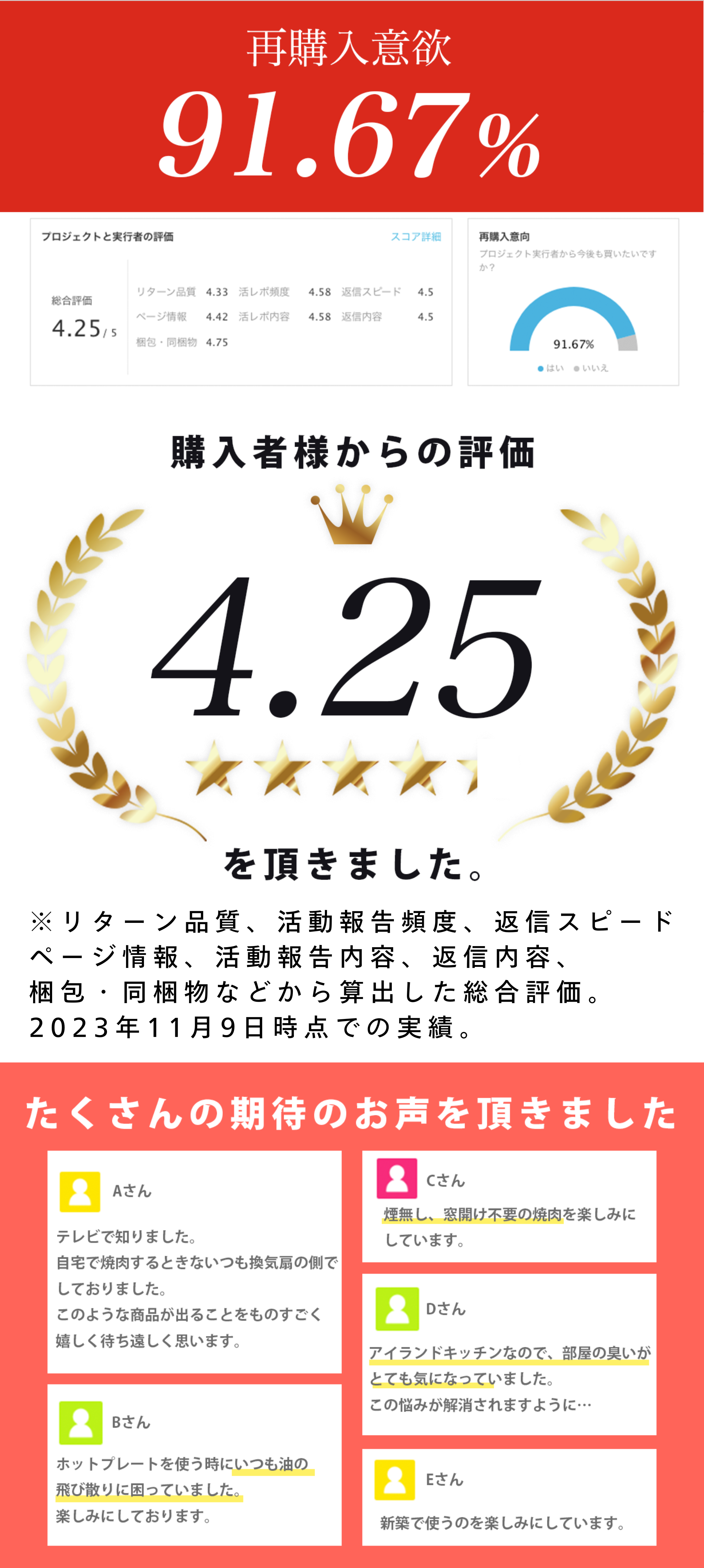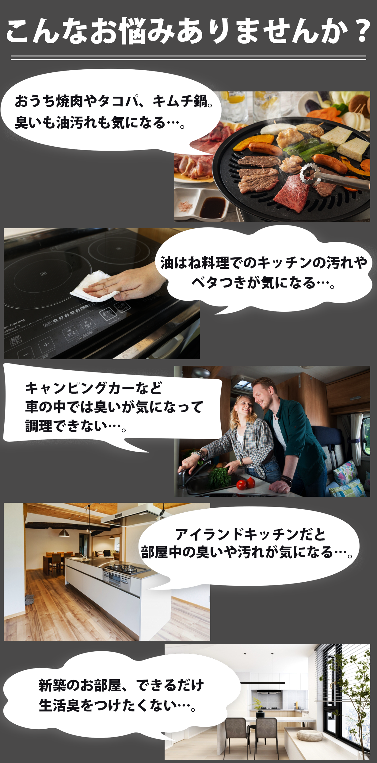 私は家(マンション)で焼肉やお鍋をしたいと思っていますが、臭いの問題がありなかなかできずにいます。また、自宅の庭でBBQをやりたい友人は、隣の家に迷惑をかけてしまうのでなかなかできないと言います。そんな経験から、この商品を是非紹介したいと思い、提案させて頂きました。
