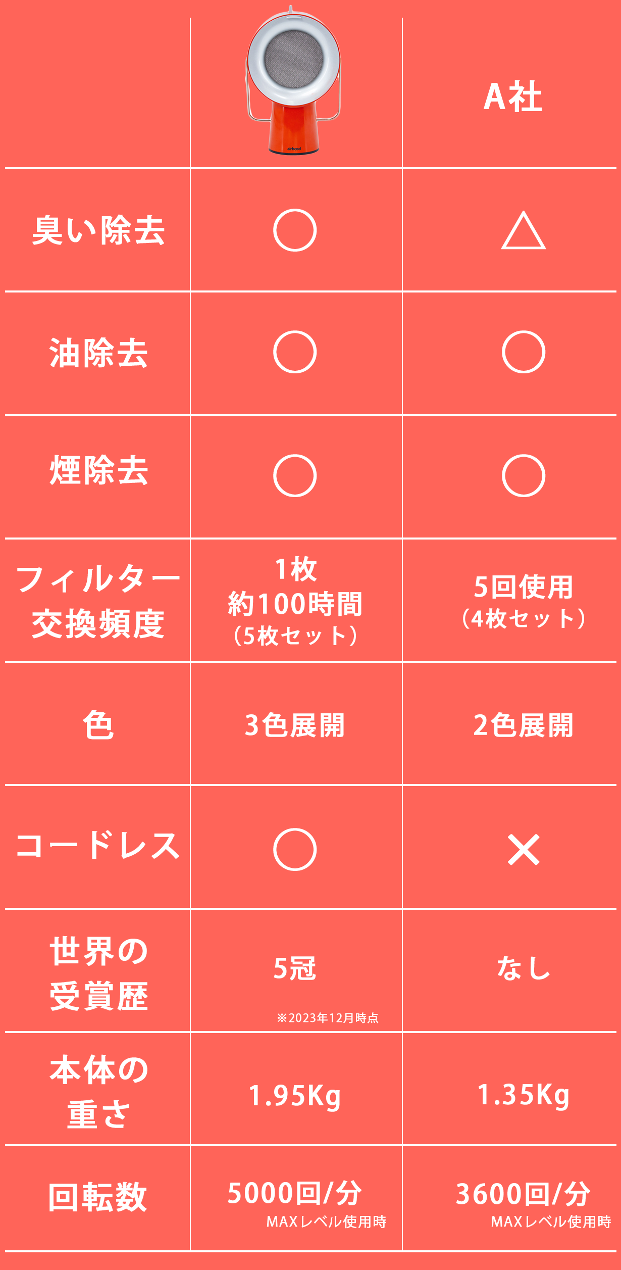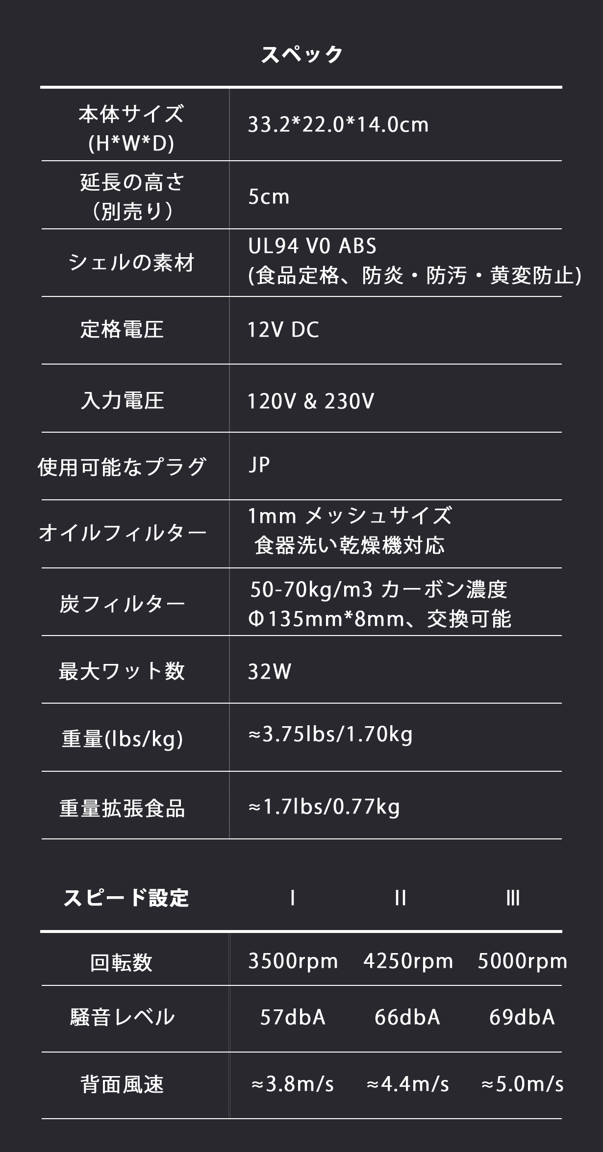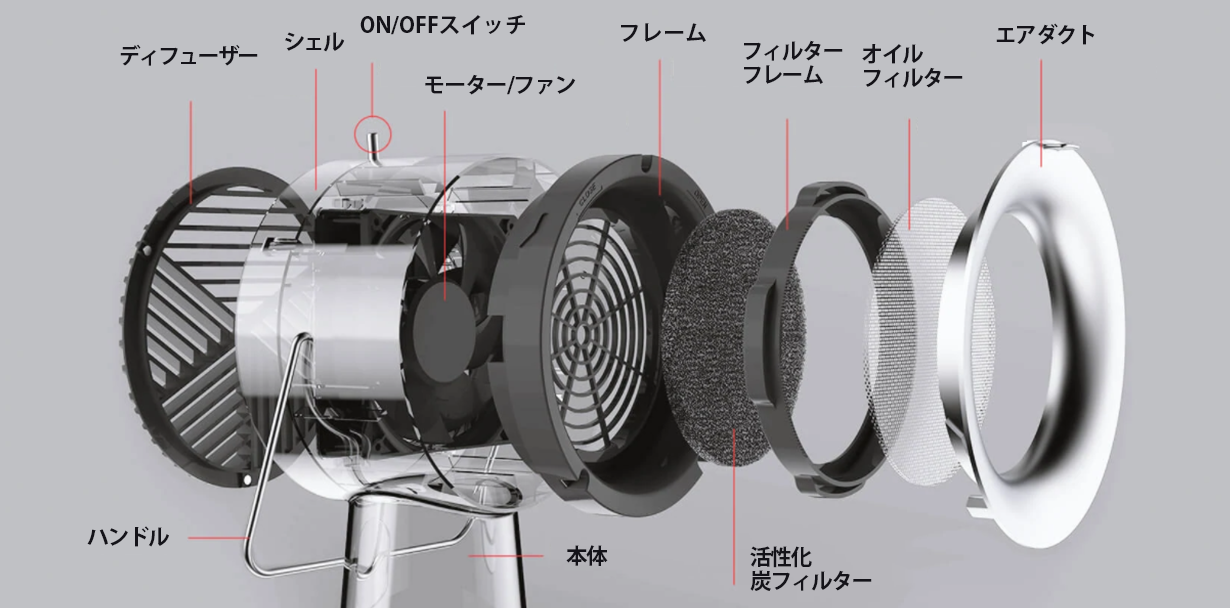 強力な換気扇が料理の煙を吸い込み活性炭フィルターを通します。スペアも付属しており数カ月間使用できます。