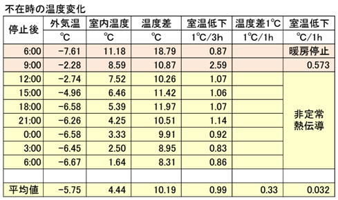 暖房停止12時~翌朝6時までが室温が温度差10.19℃のとき3時間で0.99℃低下する非定常熱伝導を表し省エネは、温度差平均10.19℃の時、室温が1時間に0.33(℃/h)低下する事から省エネ67%です。