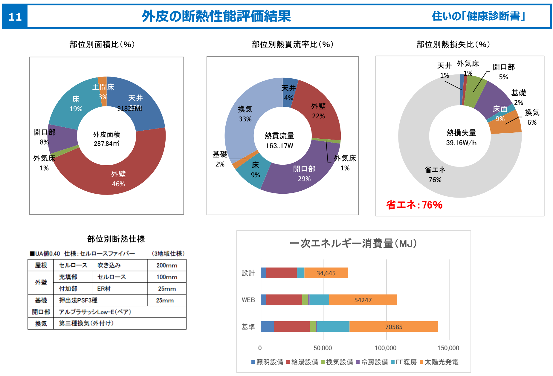 ●現在、Ua値に「換気による熱損失」33%が含まれていませんが、上表は「換気による熱損失」を含めて算出した断熱性能です。結果、換気による熱損失33%が6%に減少し、更に、開口部の熱損失29%が5%に減少します。外皮一次エネルギー消費量は基準値70、585MJが設計値34、645MJになり太陽光発電パネル設置コスト約50%削減できます。