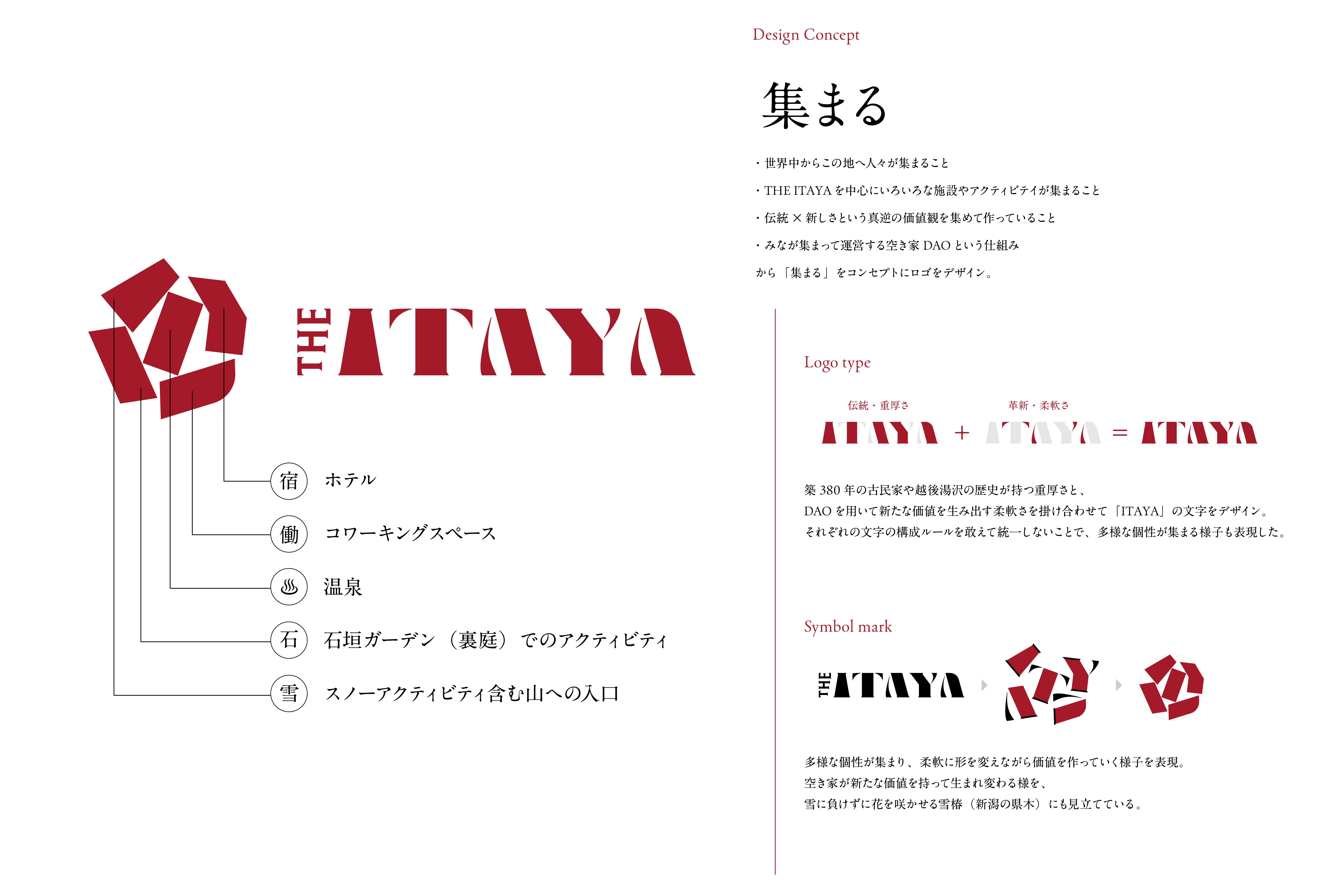 「THE ITAYA」のロゴデザインは、多様な個性が集まり、柔軟に形を変えながら価値を生み出す様子、雪に負けずに花を咲かせる雪椿(新潟の県木)にも見立てて作成を行っています。
