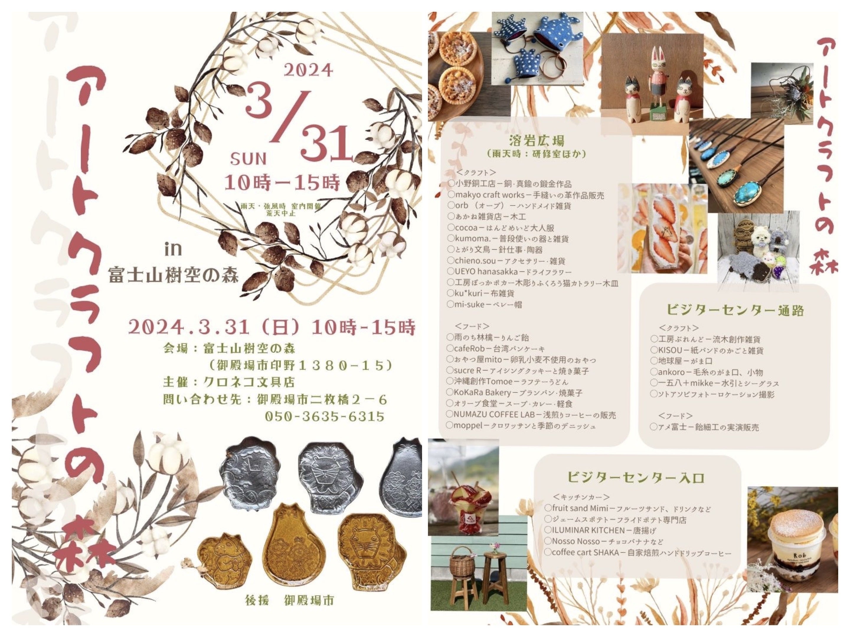 クラフト作家さん、美味しいフードが樹空の森に集結!溶岩広場や、ビジターセンターに約30店舗が集まります。一日遊べるよ~。樹空の森には、桜の名所もあるので、咲いているといいですね~☆