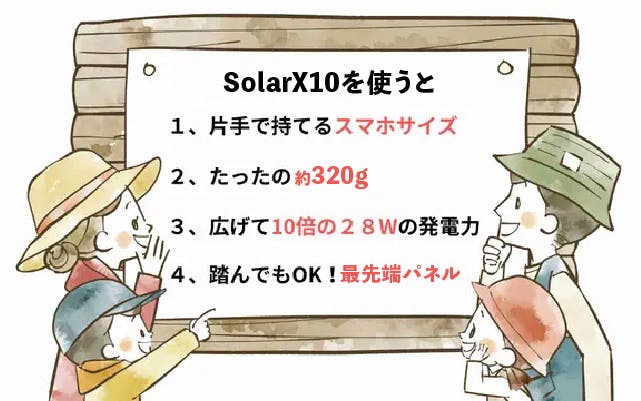 今回誕生した「SolarX10」は、アウトドア活動や災害時の非常電源としての確かな信頼性を提供し、日常生活における利便性を一層向上させることを目指しています。こちらのコンパクトなソーラーパネルは、キャンプや登山、釣りなどの自然を満喫するアウトドアシーンでの利用はもちろん、突然の停電や災害時にも電力供給を確保が可能です。また、毎日の通勤や旅行中にも簡単に持ち運び、スマートフォンやタブレットを快適に利用することも可能です!