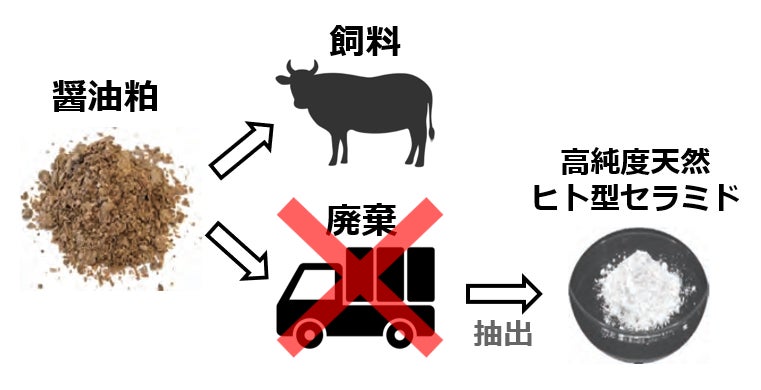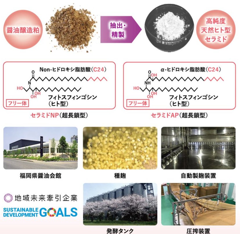 福岡県醤油醸造協同組合では2011年から10年以上にわたる研究により、醤油醸造粕から天然ヒト型セラミド(セラミドNP、セラミドAP)を高純度分離し、美肌醤潤URUOINの商品化へと至りました。