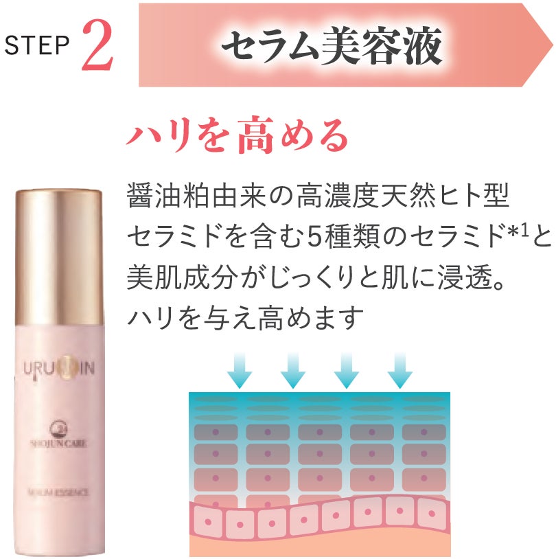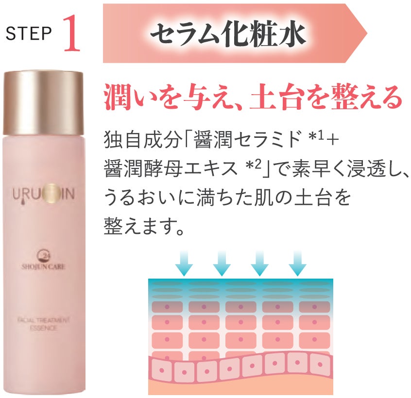今回開発した基礎化粧品シリーズ「美肌醤潤 URUOIN」は、「乾燥角質を丸ごとトリートメント」をコンセプトに商品化いたしました。その注目成分が「高純度天然ヒト型セラミド」です。セラミドは、肌の角質層に存在する保湿成分として知られていますが、中でもヒト型セラミドは肌に本来存在するものと同じ構造を持ち、肌への親和性が高いことが知られています。