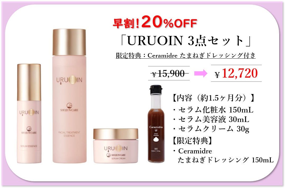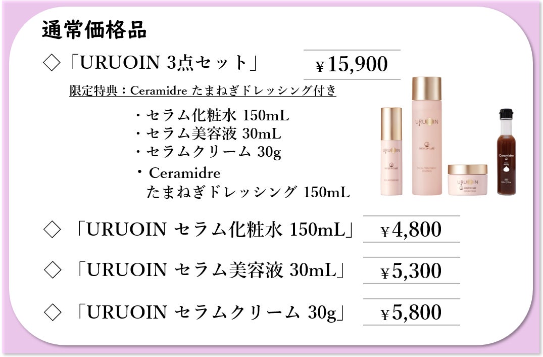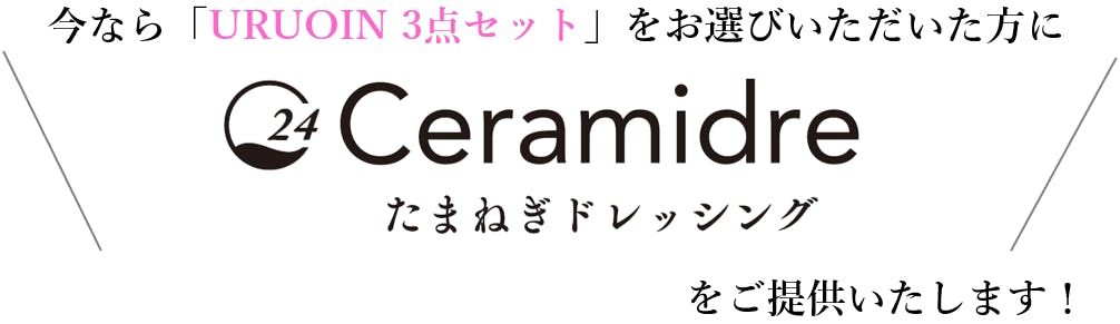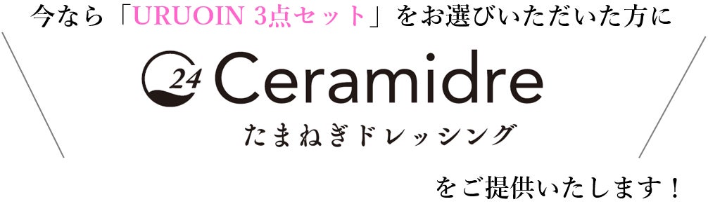 今回は「URUOIN 3点セット」をお選びいただいた方に「セラミドレ たまねぎドレッシング(150ml)」をご提供いたします!