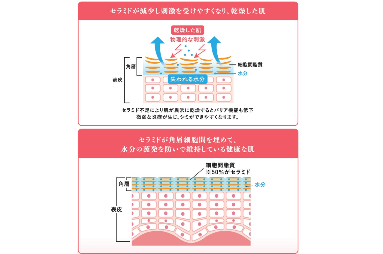 みなさま、「セラミド」という言葉を聞いたことがある方は多いのではないでしょうか。セラミドは肌へ潤いを与え、外部刺激から肌を守るために必要な成分です。今回のURUOINに配合されているセラミドはその中でも「天然ヒト型セラミド(C24超長鎖型 )」とよばれるものになります。複数種あるセラミドの中でもヒトの肌にあるセラミドと同じ構造のため肌になじみやすく、バリア機能が高いことが確認されています。ヒトは加齢等によるお肌のセラミド不足により、肌が乾燥するとバリア機能が低下、シミができやすくなってしまいます。天然ヒト型セラミド を配合したURUOINは、肌の角層をセラミドで埋めることにより、これらのトラブルからお肌を守り、健康な肌を維持します。