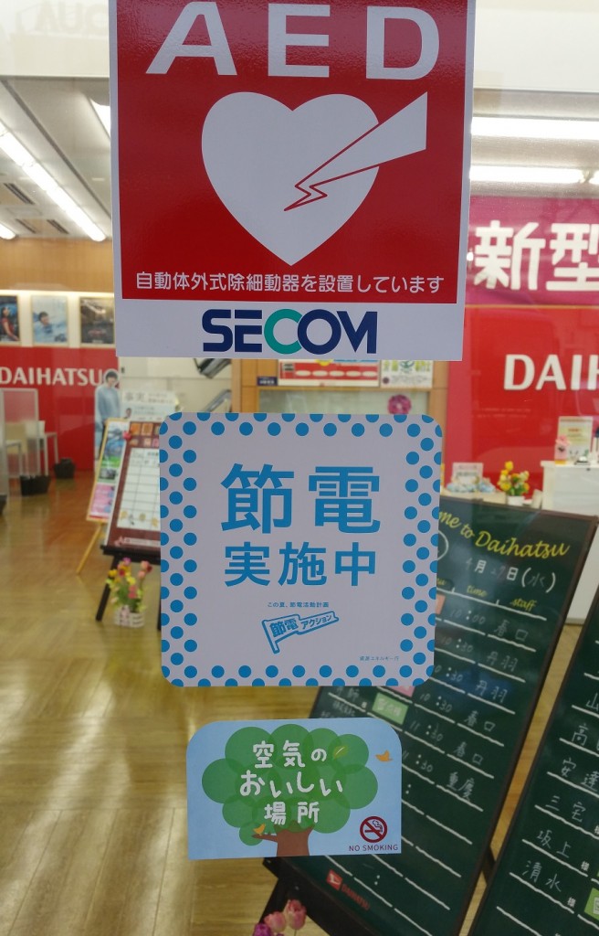 ・ダイハツユーカリが丘店の店頭に提示:前はどのカーディラーのお店も喫煙可か席を分けただけの不完全分煙の所が多く、店内での商談は本当につらかったのですが、今では店内禁煙のお店が増えて嬉しいです。