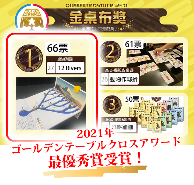 毎年春に台湾で開かれるアナログゲームの試作品のプレイテスト大会「Playtest Taiwan 2021」で、48作品中もっとも多くの票を集め、「ゴールデンテーブルクロスアワード」を受賞!