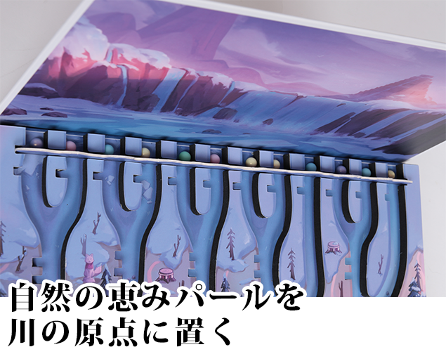 コマをボードに配置したら、12本の川に「恵みのパール」を一斉に流します。ユニークな仕組みで、みんなが盛り上がります!