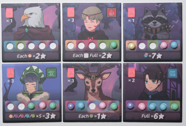 村人タイル上のパールの合計点数を計算し、村人タイルに書かれたさまざまなボーナス点を加算します。合計点が一番多いプレイヤーが勝ちです!