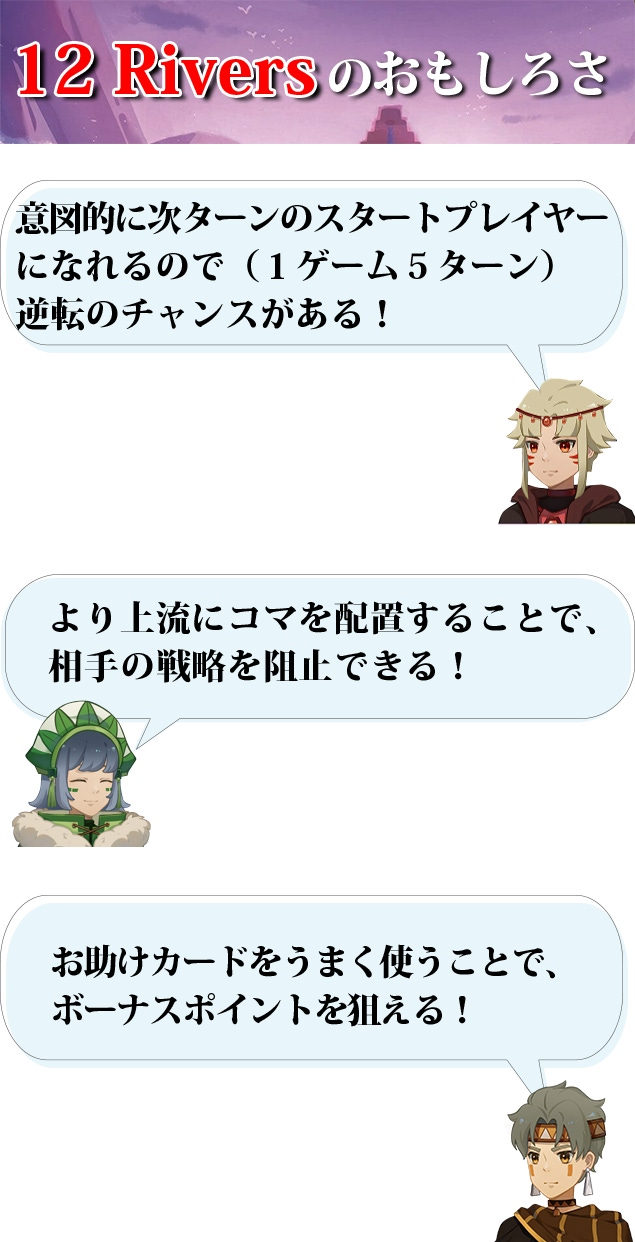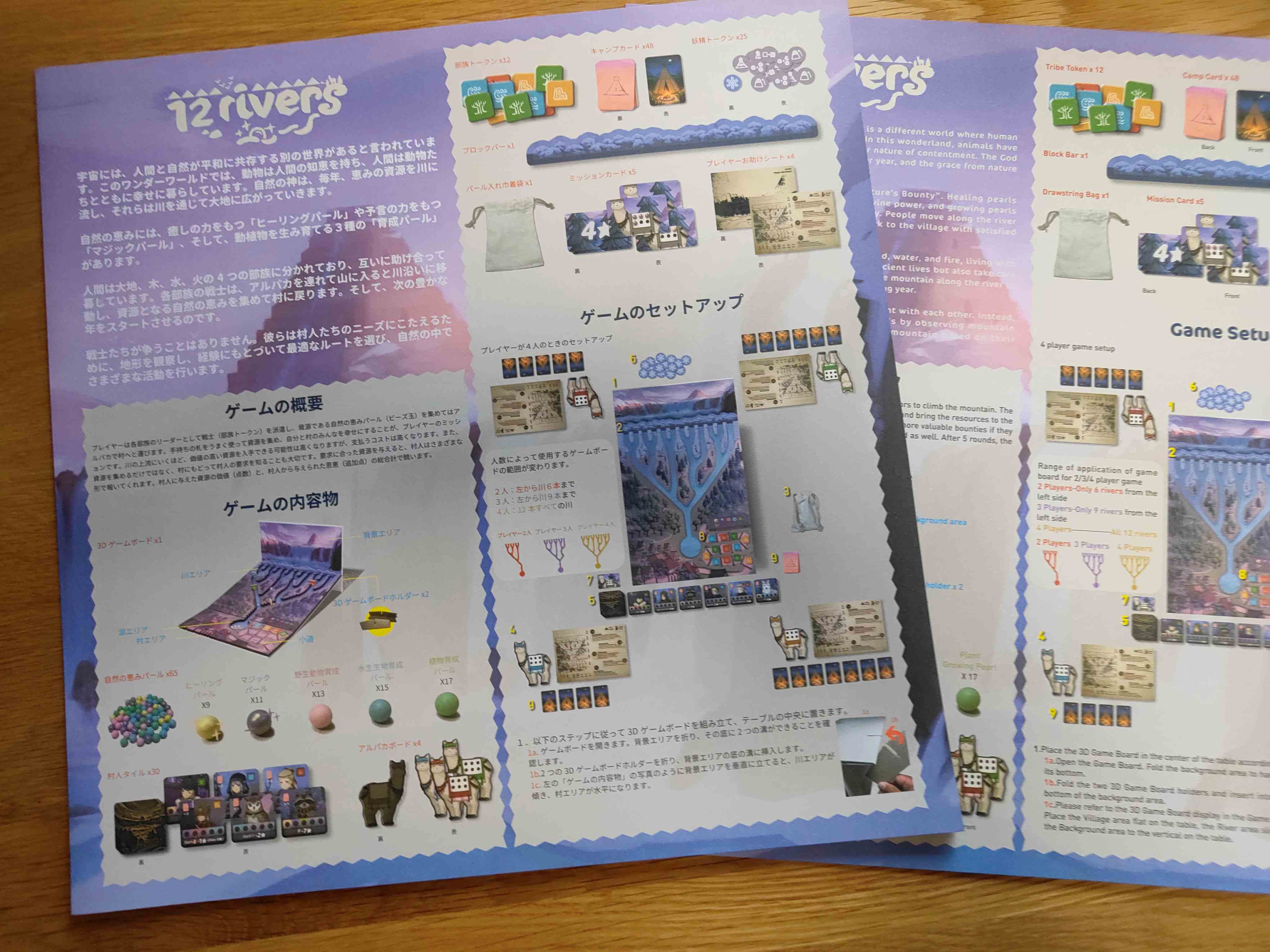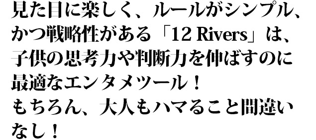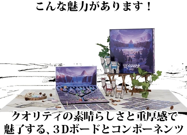 12Riversは、コンポーネンツが非常にしっかりしており手触りがよく、見た目から楽しめるボードゲームです。ルールはシンプルですが、相手の手を読みさまざまな戦略を練る楽しさや、目新しいギミックにみんなで盛り上がる楽しさもあり、ボードゲーム初心者と上級者、子供と大人が一緒に楽しむことができる素晴らしいボードゲームです。