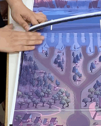 そして、上の二層(上の板紙とスポンジ)から川や湖の形を抜き抜いて地形をつくり、ところどころにコマを差し込むための溝を切りこんでいます。
