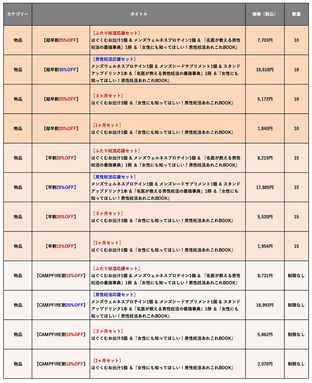 今回のプロジェクトに支援いただいた方には、以下のCAMPFIRE限定のスペシャルリターンをご用意しています。男性にも妊活をもっと身近に、早い時期から自分のカラダとしっかり向き合ってほしい。そんな想いを世の中に届けていくために、ぜひご支援いただけますと幸いです。