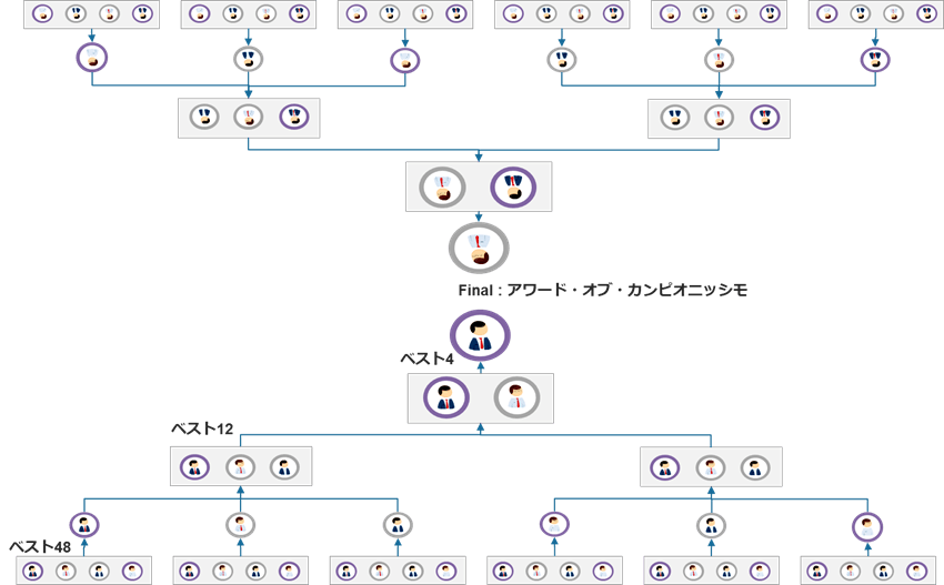 ・ベスト12 ⇒ ベスト4 ⇒ ベスト2:トーナメント形式で各選出
