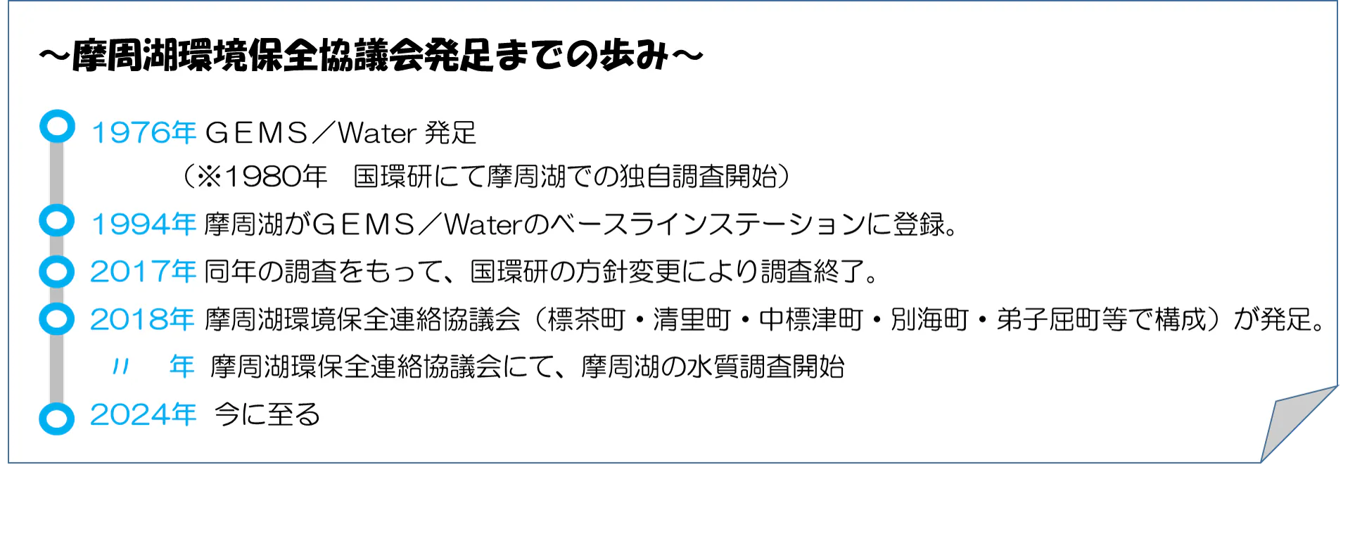 私たち、摩周湖環境保全連絡協議会(清里町・標茶町・弟子屈町・中標津町・別海町および関係機関で構成)が協力し、調査規模を縮小しながらも調査を継続しています。