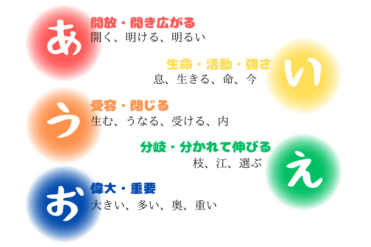 例えば「ア」は口を大きく開いて発声しますから、開く意味。