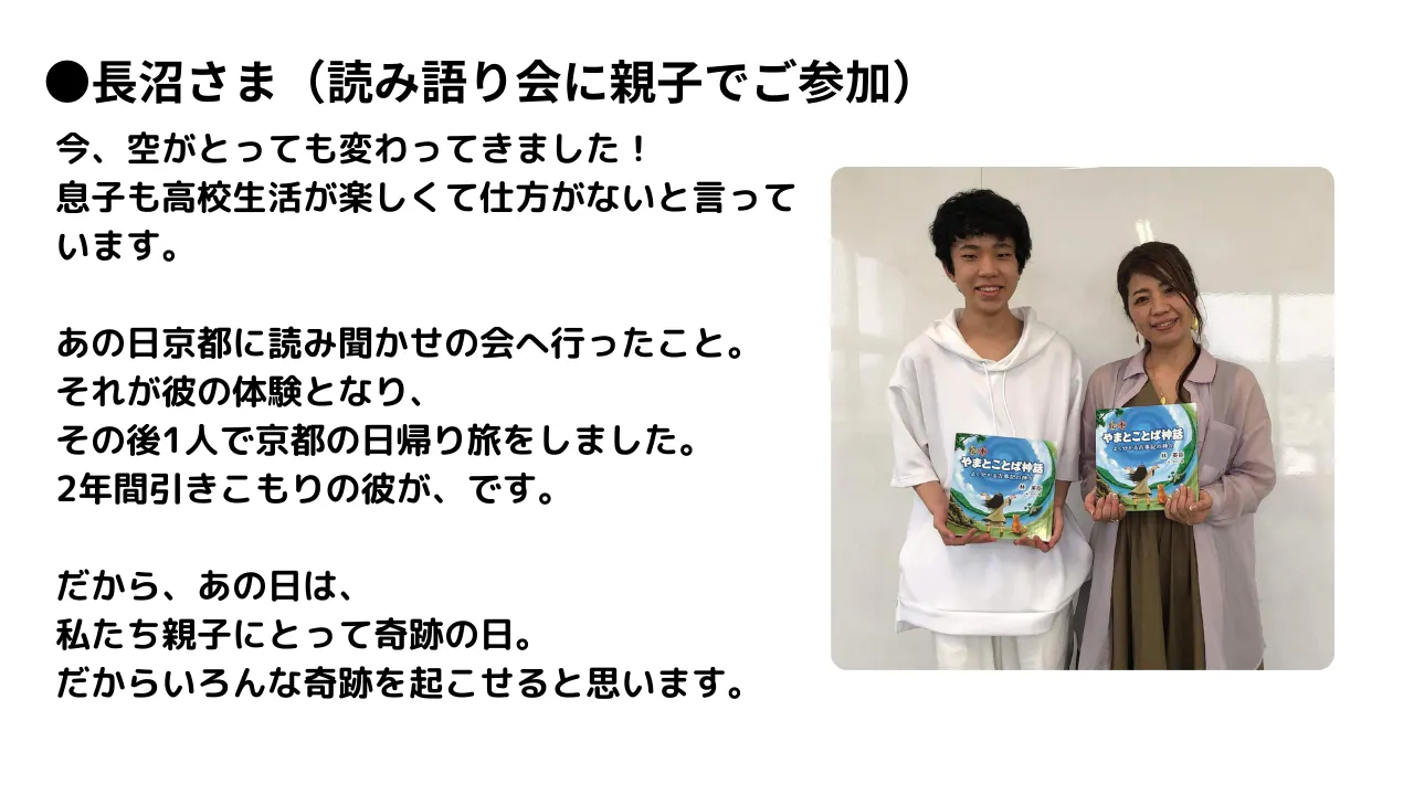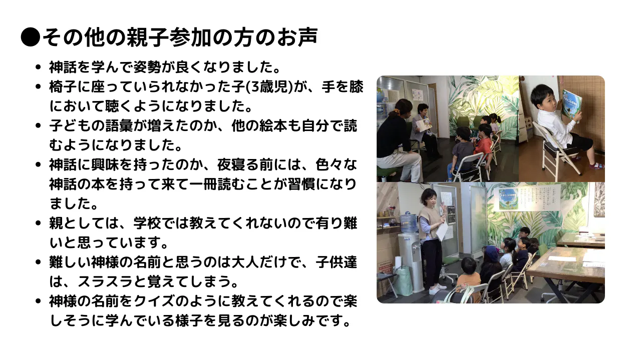 2024/08/19 22:32昨日、8月18日「やまとことばの日」設立記念イベント「やまとことばまつり」盛大に開催してまいりました!まずは、ご参加いただけなかった皆様に素敵なオープニングムービーをお裾分けいたします。https://www.youtube.com/watch?v=gYYygKYV2bA「やまとことば」にまつわるいろんなコンテンツをギュッとまとめた3時間。・倍音声明・林英臣先生によるやまとことばミニ講演・「絵本やまとことば神話」朗読劇・古事記冒頭文の音読・やまとことばクイズ・やまとことば姓名鑑定とても素晴らしく温かなイベントとなりました。改めましてご参加いただきました皆様、そしてご支援をいただきました皆様に感謝申し上げます。ご参加の皆様からもとてもうれしいご感想をいただいておりますので、一部をご紹介させていただきます!***************●小学生 S・Tさんこうはんで子どもでもたのしめるようなものがあってたのしかった●10代 遠山稜太さんやまとことばについて詳しく知らなかったが親と来てとても面白かった●30代 O・Hさん姓名鑑定は参加者を巻き込み、大変盛り上がる企画だと感じました。自己肯定感を高める魅力的なコンテンツだと思います。また、クイズ形式は楽しく理解の深まる企画だと感じました。会が全体的に明るく良い雰囲気でした。●30代 松倉宏之さん朗読劇ははじめて聞きました!音と絵で感じることができました。また心温まる会でした。●40代 前田さんステキな時間をありがとうございました。会場全員で朗読させていただいた時、とても気持ちが良かったです。●40代 マミヨさんやまとことばをもっと知りたくなりました。日本に生まれてよかった‼●40代 まりこさん実践あり教育ありのとてもすばらしくテーマが一体化したイベントでした。4年に1度でも良いのでまた開催してほしいです。●40代 M・Kさんやまとことばに一音一音、大切なエネルギーが宿り波動となり、広がる事を知り、奥深いやまとことばを学びたくなりました。そして大切に言の葉をつむいでいきたいです。イベントをたくさんして頂き、みなさんにも知って頂きたいです。●40代 鶴岡英津子さん来場されている皆さん(運営の方も含めて)のお顔と佇まいがとてもおだやかで朗らかで、この場に居させて頂くだけで浄化されるような良いエネルギーでした。●40代 あおしんさん日本語の持つ力というのを知ることができました。日常の言葉、一語一語を大事に使っていこうと思いました。●50代 坂本ひろこさん心が洗われるような、素敵なイベントでした。今まであまり「やまとことば」に触れたことがなかったので新鮮でした。「日本の心」を感じました。一文字一文字の意味を知ることができて嬉しかったです。●50代 よっしーさん倍音声明は会場が一体感とゆるんだ感じが一気に生まれて、本当に楽しくなっていきました。●50代 秦明日香さん心地の良いやまとことばに包まれて幸せな気持ちともっと深く知りたい気持ちになりました。●60代 小林麻衣子さんおだやかな会場の雰囲気の中、素晴らしい方々の心落ち着くお話をありがとうございました。たくさんの方に知ってもらいたい内容でした。●70代 田中栄一さん良い取り組みをされていますね。アットホームなやさしい場のエネルギーを感じました。 もっと見る