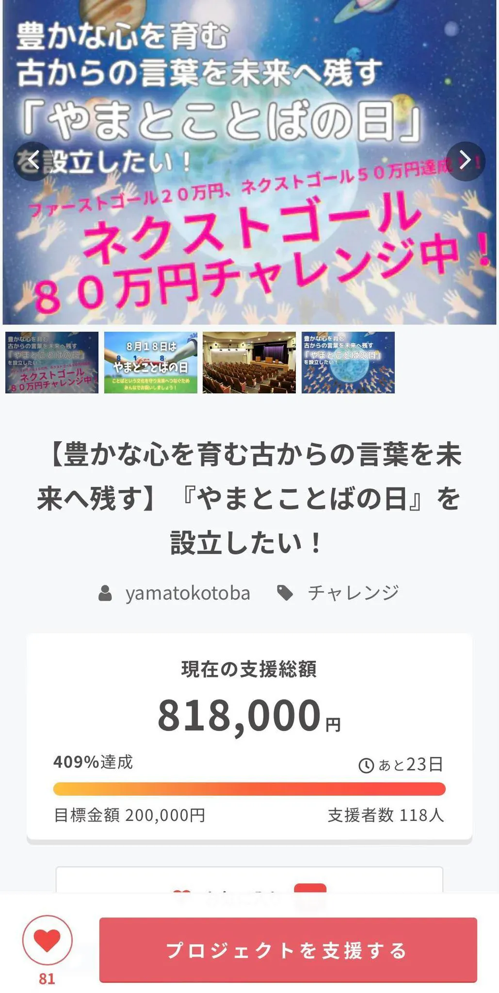 「やまとことば」の818の入った記念すべき支援金額へのご支援者も!