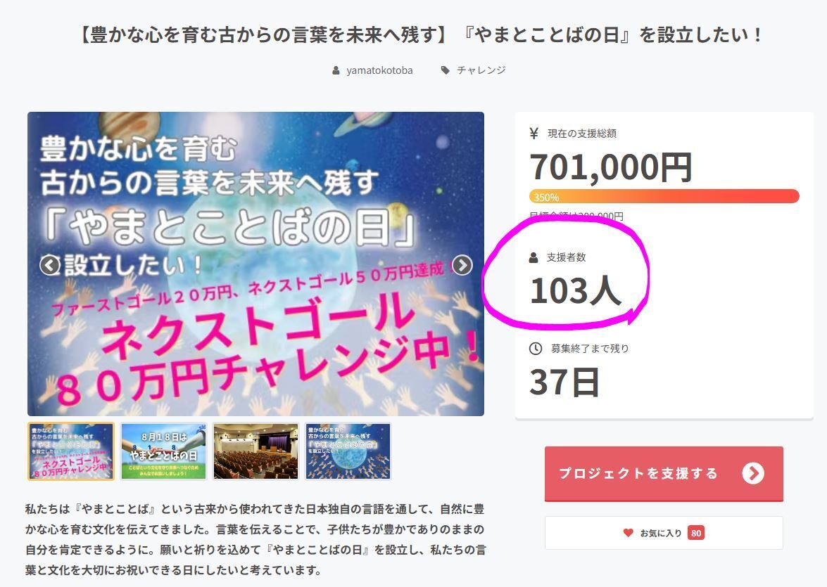 プロジェクト開始から60日目を迎えております!少しずつゴールも近づいてくる中、ついに2つ目のゴール80万円を達成しました!!多くのご支援・応援・励ましのメッセージ・SNS投稿シェアありがとうございます。本日時点で達成率412%に到達。そして、支援金額「818,000円」という、「やまとことば」の818の入った記念すべき支援金額へのご支援者も!8/18のイベントご参加目標100名まであと61名。イベントに向けても着々と準備中です。引き続きよろしくお願いいたします。