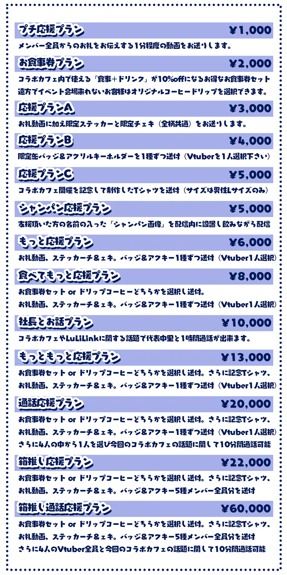 全プラン共通でLuLiLinkコラボカフェ開催記念公式放送内にてクレジット表記&お名前呼びを行います。
