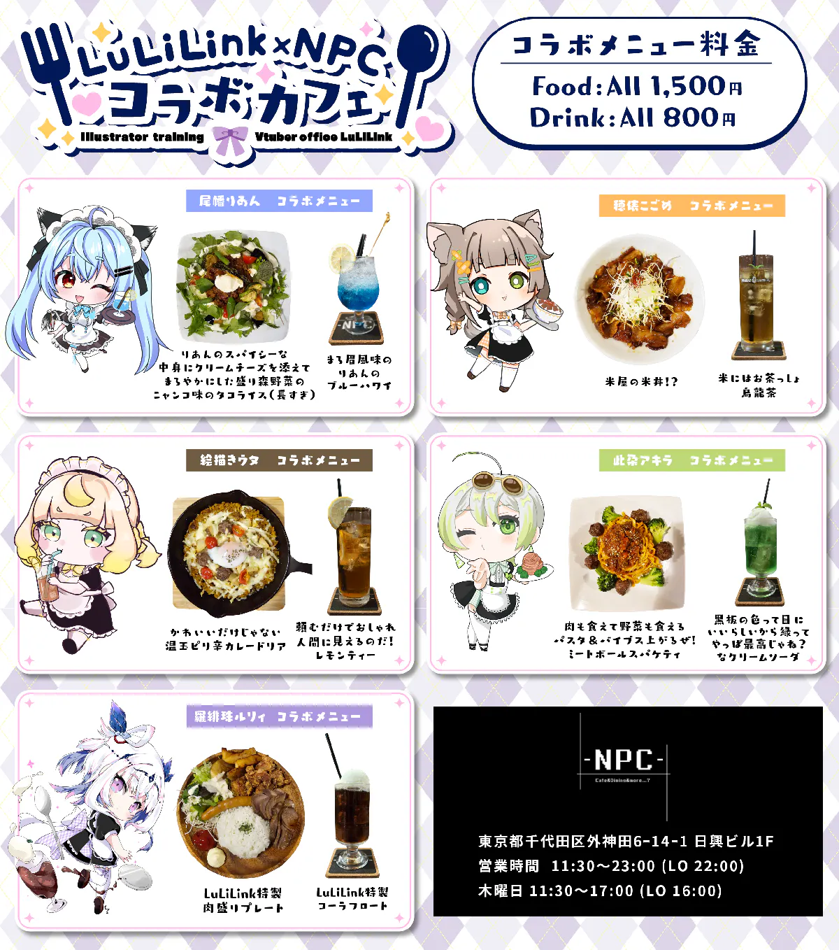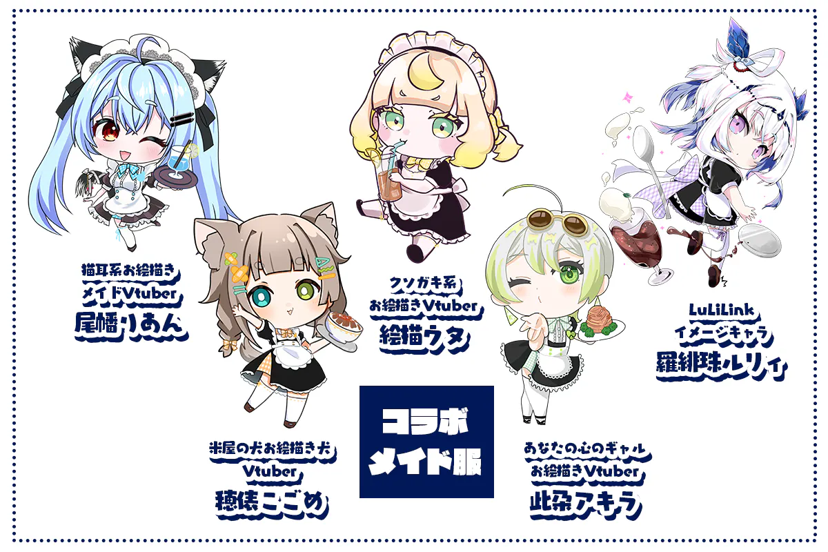コラボメニューは「尾幡りあん」「穂俵こごめ」「絵描ウタ」「此朶アキラ」それぞれが考案した5つの食事、5つのドリンクのほか、LuLiLinkイメージキャラクターのルリィちゃんメニューを足した全5種の食事+ドリンクとなります。