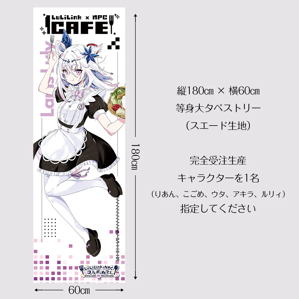 2024/06/26 17:00LuLiLink×NPCのコラボカフェを目的としてクラウドファンディングも残り4日となりました!皆さまの声援のおかげで目標金額は開始1時間で達成し、ネクストゴールとして定めた2つの目標も達成することが出来ました!残すところ4日となりますが引き続き宜しくお願いします。ネクストゴールの2つ目として、タレントそれぞれの等身大タペストリーを設定させてもらっています。イラストはVtuber本人が描き下ろしたもので、それぞれの特徴が出ていると思います。こちらの等身イラストはイベント中にランチョンマットにしたりコースターにしたりと活躍しますが、全身を大きくプリントして持っておけいるのはこの等身大タペストリーだけになります!他のグッズは基本的にコラボカフェ期間中お店でも販売しますが、等身大タペストリーは完全受注生産となりますので、是非この機会にご支援ください! もっと見る
